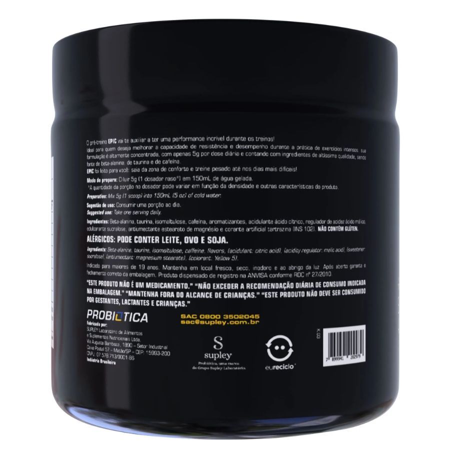 Sobre o ProdutoO pré-treino EPIC vai te auxiliar a ter uma performance incrível durante os treinos! Ideal para quem deseja melhorar a capacidade de resistência e desempenho durante a prática de exercícios intensos, sua formulação é altamente concentrada, com apenas 5g por dose diária e contando com ingredientes de altíssima qualidade, sendo fonte de beta-alanina, de taurina e de cafeína. EPIC foi feito para você: saia da zona de conforto e treine pesado até nos dias mais difíceis! DestaquesLactose: Não Contém. Recomendação de usoConsumir uma porção ao dia. Indicado para maiores de 19 anos. Produto dispensado de registro na ANVISA conforme RDC n 27/2010. Ingredientes Sabor: Brazilian Fruits Beta-alanina, taurina, isomaltulose, cafeína, aromatizantes, acidulante ácido cítrico, regulador de acidez ácido málico, edulcorante sucralose, antiumectante estearato de magnésio e corantes artificiais amaranto e azul brilhante fcf. NÃO CONTÉM GLÚTEN. Sabor: Frutas Vermelhas Beta-alanina, taurina, cafeína, aromatizante, acidulante ácido cítrico, edulcorante sucralose, antiumectante dióxido de silício ecorantes artificiais amaranto e azul brilhante fcf. NÃO CONTÉM GLÚTEN. Sabor: Guaraná com laranja Beta-alanina, taurina, cafeína, aromatizantes, acidulante ácido cítrico, regulador de acidez ácido málico, corante artificial caramelo IV, edulcorante sucralose e antiumectante dióxido de silício. NÃO CONTÉM GLÚTEN. Sabor: Limão Beta-alanina, taurina, isomal?tulose, cafeína, aromatizante, acidulante ácido cítrico, regulador de acidez ácido málico, edulcorante sucralose, antiumectante dióxido de silício, corantes artificiais amarelo tartrazina (INS 102) e azul brilhante fcf. NÃO CONTÉM GLÚTEN. Sabor: Melancia Beta-alanina, taurina, isomaltulose, cafeína, aromatizante, acidulante ácido cítrico, regulador de acidez ácido málico, edulcorante sucralose, antiumectante estearato de magnésio e corante artificial vermelho 40. NÃO CONTÉM GLÚTEN. Advertências ESTE PRODUTO NÃO É UM MEDICAMENTO. NÃO EXCEDER A RECOMENDAÇÃO DIÁRIA DE CONSUMO INDICADA NA EMBALAGEM. MANTENHA FORA DO ALCANCE DAS CRIANÇAS. ESTE PRODUTO NÃO DEVE SER CONSUMIDO POR GESTANTES, LACTANTES E CRIANÇAS. Modo de PreparoDiluir 5g (1 dosador raso*) em 150mL de água gelada. *A porção no dosador pode variar em função da densidade e outras características do produto. BenefíciosBeta Alanina 2g Taurina 1.200mg Cafeína 200mg: Auxilia no Aumento da Capacidade de Resistência e no Desempenho de Exercícios Físicos de Resistência. Pre Workout AlergênicosPODE CONTER LEITE, OVO E SOJA.