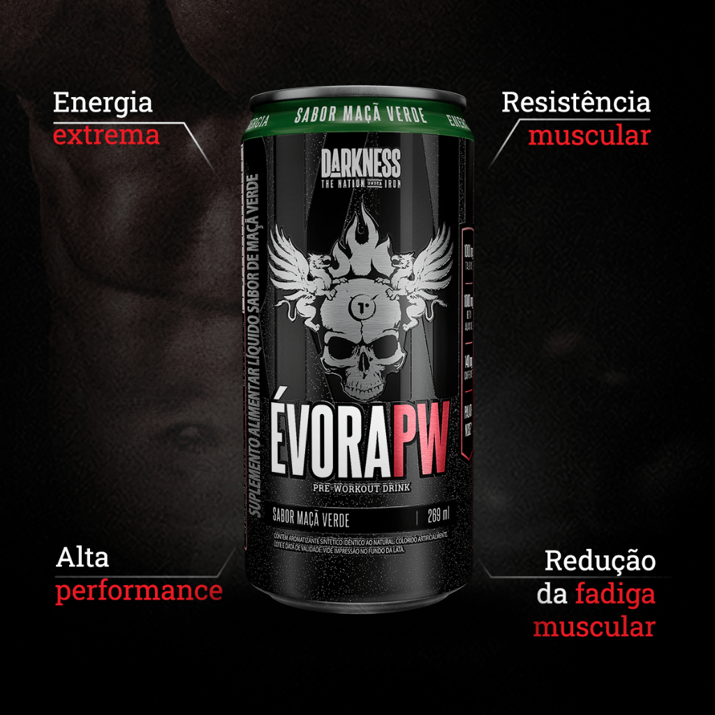 Évora RTD é um suplemento pré-treino Darkness desenvolvido para proporcionar treinos mais potentes com foco em resultados extremos. Além de uma fórmula que traz ingredientes energéticos e neuroestimulantes, o Évora PW RTD oferece praticidade de consumo por ser uma bebida pronta, comercializada em pack com 6 latas. Basta pegar uma e partir para o treino, mantendo-se alerta e disposto do início ao fim. É ideal para prolongar treinos pesados. Só os Grandes Ressurgem Mais Fortes Uma nação clama pelo meu retorno. Com gloria me levanto, ainda mais poderoso, para mostrar ao mundo quem sou! ÉVORA, ENERGIA E FOCO MENTAL À NÍVEL SOBRENATURAL! Vantagens e diferenciais do pré-treino Évora PW RTD 6 unidades Évora PW RTD é vendido em packs com 6 latas (269 ml) do suplemento, na forma de bebida pronta e com sabor de maçã verde. Esse suplemento pré-treino Darkness oferece: 1 g de beta-alanina; 140 mg de cafeína; 1 g de taurina; Palatinose; Zero sódio; Zero gordura; Zero açúcar. As principais vantagens do Évora PW RTD são: Energia intensa; Melhora do foco; Resistência muscular; Alta performance; Redução de fadiga muscular; Praticidade de consumo. Nutreline Suplementos