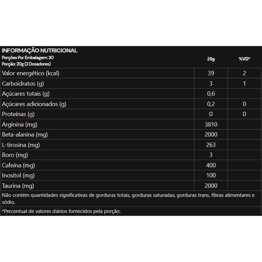 Sobre o Produto: Fckng Booster Ecstasy Energy da Under Labz, sabor Psycho Red, é um pré-treino de última geração que oferece uma experiência extrema de estímulo físico e mental. Inspirado na intensidade e energia dos maiores festivais do mundo, este suplemento proporciona euforia controlada, foco absoluto e desempenho explosivo. Sua fórmula avançada combina ingredientes neuroestimulantes e vasodilatadores que agem de forma sinérgica para elevar seu treino a um novo nível, com energia duradoura e sem efeitos colaterais severos. Como Consumir - Misture uma porção (conforme instrução da embalagem) em aproximadamente 200 ml de água gelada. - Consumir de 20 a 30 minutos antes do treino. - Não exceder a dose recomendada. - O uso deve ser orientado por um profissional da saúde. Benefícios - Estímulo físico intenso com clareza mental - Aumento de força, foco e resistência - Energia prolongada sem efeito rebote - Vasodilatação e pump muscular acentuados - Redução da fadiga e melhora da performance - Ideal para treinos de alta intensidade - Fórmula com ação rápida e potente Alergênicos - Pode conter derivados de leite e ovo. - Não contém glúten. Ingredientes: Cloridrato de L-arginina, maltodextrina, beta-alanina, taurina, cafeína, isomaltulose, L-tirosina, inositol, tetraborato de sódio, acidulante ácido cítrico, antiumectantes dióxido de silício e fosfato tricálcico, aromatizante idêntico ao natural, edulcorantes sucralose e acessulfame de potássio, corante vermelho ponceau. Advertências - Produto indicado para adultos saudáveis. - Não recomendado para gestantes, lactantes, crianças ou pessoas com condições médicas sem orientação profissional. - Contém alta dose de cafeína. - Pessoas com sensibilidade a estimulantes, hipertensão, problemas cardíacos ou neurológicos devem consultar um médico. - O uso excessivo pode causar insônia, agitação e taquicardia. - Conservar em local fresco e seco, fora do alcance de crianças. - Este suplemento não substitui uma alimentação equilibrada. Conclusão: O Fckng Booster Ecstasy Energy da Under Labz, sabor Psycho Red, oferece uma performance incomparável em treinos exigentes. Combinando potência, euforia controlada e clareza mental, sua fórmula foi pensada para quem busca intensidade máxima e rendimento extremo. Um verdadeiro catalisador de performance para transformar seus treinos em uma experiência completa e explosiva.