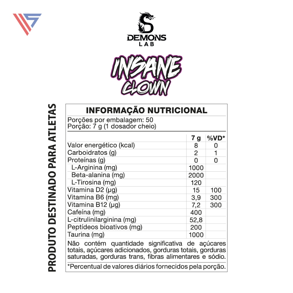 Pré Treino Insane Clown 350g Demons Lab Bem-vindo à Vita Shopping, o seu destino de saúde e performance! Trabalhamos com suplementos de alto padrão, com garantia de procedência, segurança na compra e os lançamentos que você procura. Mais que uma loja, somos seu parceiro de resultados. Descrição do produto: Apresentamos o Insane Clown, o pré-treino que vai revolucionar sua rotina de exercícios. Projetado para atletas que buscam um desempenho extremo e resultados incríveis, o Insane Clown é a combinação perfeita de energia, foco e resistência. Informações Técnicas: Marca: Demons Lab Formato do suplemento: Pó Gramagem: 350g Peso da porção: 7g Formato de venda: Unidade Tipo de embalagem: Pote Ingredientes: Beta-alanina, Isomaltulose (Palatinose"), L-arginina,Taurina, Caféina/1,3,7-Trimethylxanthine, Colostro Bovino Desnatado, L-tirosina, Alga Chondrus Crispus Invernal, Vitamina D2 (Pó de Cogumelo Agarius Bisporus contendo vitamina D2 tratados com radiação UV), Vitamina B6 (Cloridato de Piridoxina), Vitamina B12 (Cianocobalamina), Fosfato Tricálcico, Antiumectante Dióxido de Sílicio, Edulcorante Sucralose, Aroma Idêntico ao Natural de Baunilha Azul, Corante Azul Brilhante. COLORIDO ARTIFICIALMENTE. NÃO CONTÉM GLUTÉN. CONTÉM CITRULINA. CONTÉM LACTOSE. ALÉRGICOS: PODE CONTER LEITE, PEIXES E CRUSTÁCEOS (caranguejo, lagosta, lagostim coral e camarão). Benefícios: Aumento significativo da vascularização; Melhora na recuperação muscular; Aumento de energia; Aumento da resistência muscular. Sugestão de uso: Porção de 7g (1 dosador cheio) em 210ml de água. Conteúdo da embalagem: 1 Pré Treino Insane Clown 350g Demons Lab