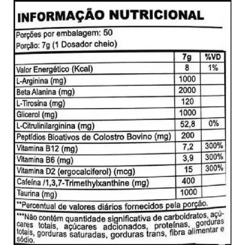 Sobre o produto: Insane Clown da Demons Lab é um pré-treino formulado para atletas que buscam máxima performance, foco e energia nos treinos mais intensos. Com uma composição potente, este suplemento foi desenvolvido para proporcionar estímulos físicos e mentais, favorecendo a força, resistência e concentração. Cada dose é projetada para preparar o corpo e a mente para enfrentar os treinos mais desafiadores, otimizando os resultados e auxiliando na superação dos limites. Como consumir - Misturar 1 scoop (aproximadamente 7g) em 200ml de água gelada. - Consumir de 20 a 30 minutos antes do treino. - Importante: Não exceder a dose recomendada. - Não consumir mais de uma dose ao dia. Benefícios - Aumento da energia e disposição antes e durante os treinos - Melhora do foco e da concentração mental - Estímulo à resistência física e muscular - Auxílio no desempenho atlético - Sensação de alerta e redução da fadiga mental - Efeito vasodilatador, promovendo maior fluxo sanguíneo durante os exercícios Alergênicos - Pode conter derivados de soja, leite, ovo e trigo. - Produzido em equipamento que processa alimentos com esses ingredientes. Ingredientes - Cafeína, taurina, beta-alanina, arginina alfa-cetoglutarato, citrulina malato, creatina monohidratada, tirosina, glucoronolactona, niacina, maltodextrina, aromatizante, acidulante ácido cítrico, antiumectante dióxido de silício, edulcorantes sucralose e acessulfame de potássio, corante artificial. - A composição pode variar de acordo com o sabor. - Verifique o rótulo do produto para informações específicas. Advertências - Produto indicado exclusivamente para adultos saudáveis. - Não recomendado para crianças, gestantes, lactantes, pessoas com sensibilidade à cafeína ou com problemas cardíacos. - Consulte um profissional de saúde antes de iniciar o uso deste suplemento. - Armazenar em local seco e fresco, ao abrigo da luz solar direta. - Manter fora do alcance de crianças. - O consumo deste produto deve estar associado a uma alimentação equilibrada e hábitos de vida saudáveis. Conclusão: Insane Clown 350g da Demons Lab é uma escolha ideal para quem busca um pré-treino de alta potência, voltado para maximizar desempenho, energia e foco. Com uma fórmula cuidadosamente balanceada, ele atende tanto atletas experientes quanto praticantes em busca de evolução. Respeitando as recomendações de uso e aliando a suplementação a um estilo de vida saudável, este produto pode ser um grande aliado na superação de limites e na conquista de resultados expressivos nos treinos.