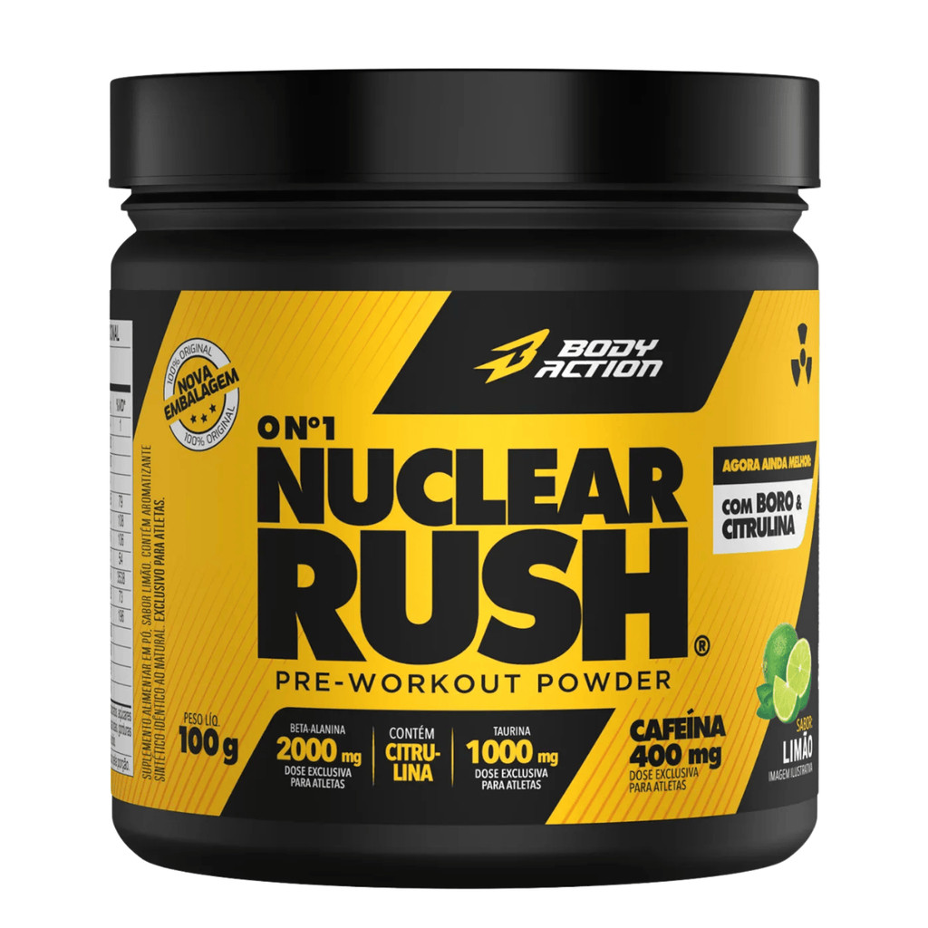 Sobre o Produto: O Nuclear Rush da Bodyaction é um suplemento pré-treino desenvolvido para atletas e praticantes de atividades físicas que buscam máxima performance durante os treinos mais intensos. Com uma fórmula potente, concentrada em ingredientes estimulantes e vasodilatadores, o produto promove maior energia, foco e resistência muscular. Sua composição foi pensada para acelerar o metabolismo, retardar a fadiga e melhorar o desempenho físico em atividades de alta intensidade. Como Consumir - Dissolva uma porção de 5g (1 scoop) em 200ml de água gelada, preferencialmente 30 minutos antes do treino ou conforme orientação de nutricionista ou médico. - Não exceder a dose recomendada. Benefícios - Aumento significativo de energia e disposição - Estímulo ao foco mental e concentração durante o treino - Maior resistência e redução da fadiga muscular - Estímulo à vasodilatação e ao "pump" muscular - Auxílio na queima de gordura através do aumento do metabolismo - Melhora na performance e intensidade dos treinos Alergênicos - Pode conter derivados de leite, soja, ovo e trigo. - Produzido em equipamento que também processa esses ingredientes. Ingredientes - Taurina, cafeína, beta-alanina, arginina alfa-cetoglutarato (AAKG), citrulina, creatina monohidratada, inositol, vitaminas do complexo B (B3, B6, B12), ácido fólico, maltodextrina, acidulante ácido cítrico, aroma idêntico ao natural, edulcorantes (sucralose, acessulfame de potássio), corantes artificiais. - A composição pode variar de acordo com o sabor. - Sempre consulte o rótulo da embalagem. Advertências - Produto indicado para maiores de 19 anos. - Não é recomendado para gestantes, lactantes, crianças ou pessoas com sensibilidade à cafeína. - Consulte um profissional de saúde antes de iniciar qualquer suplementação. - Manter fora do alcance de crianças. - Conservar em local fresco, seco e ao abrigo da luz solar direta. - Não exceder a dose diária recomendada. - Este produto não substitui uma alimentação equilibrada e seu consumo deve estar associado a um estilo de vida saudável. Conclusão: O Nuclear Rush 100g da Bodyaction é uma escolha certeira para quem busca máxima intensidade nos treinos. Sua fórmula altamente concentrada combina ingredientes que aumentam a energia, o foco e a resistência muscular, proporcionando treinos mais produtivos e eficazes. Ideal para atletas e praticantes de musculação que desejam um desempenho superior com mais explosão e definição muscular.