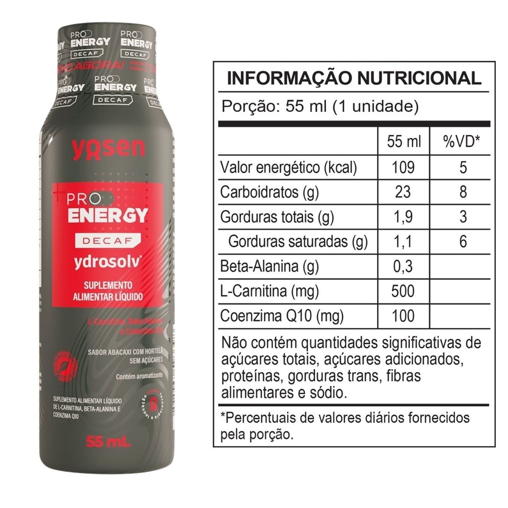 Sobre o produto: O Pro Energy Decaf da Yosen é um pré-treino líquido desenvolvido para otimizar o desempenho físico, a resistência e o foco mental — sem conter cafeína. Ideal para treinos noturnos ou para pessoas com sensibilidade à cafeína, ele combina ingredientes como L-Carnitina, Beta-Alanina e Coenzima Q10, que favorecem maior energia, recuperação muscular e performance. Sua forma líquida permite absorção mais rápida e eficiente, com fórmula livre de açúcar, corantes artificiais e glúten, sendo também aprovado para veganos. Como consumir - Recomenda-se consumir 1 frasco (55ml) cerca de 40 minutos a 1 hora antes do treino, ou conforme a orientação do médico ou nutricionista. - Indicado para adultos (a partir de 19 anos). Benefícios - Fórmula líquida para absorção rápida e eficiente - Auxilia na melhora da performance física e da resistência muscular - Aumenta a energia e o foco mental durante os treinos - Sem cafeína, ideal para uso noturno ou para quem tem sensibilidade - Livre de açúcar, corantes artificiais e glúten - Indicado para veganos - Prático para o dia a dia: embalagem pronta para consumo - Contém L-Carnitina, Beta-Alanina e Coenzima Q10 Alergênicos: Contém derivados de soja. Não contém glúten. Ingredientes: Água, triglicerídeos de cadeia média, L-carnitina, beta-alanina, coenzima Q10, agente de massa glicerol, emulsificante lecitina, aromatizantes e conservante sorbato de potássio. Advertências - Produto destinado a adultos (19 anos). - Pessoas com condições médicas, gestantes ou lactantes devem consultar um profissional de saúde antes de iniciar o uso. - Não exceder a dose recomendada. - Manter fora do alcance de crianças, armazenado em local fresco e seco. Conclusão: O Pré-Treino Pro Energy Decaf da Yosen é uma alternativa eficaz, prática e sem estimulantes para quem busca melhorar o desempenho físico, a energia e a recuperação muscular sem os efeitos da cafeína. Com uma combinação de ativos reconhecidos e rápida absorção, é ideal tanto para atletas quanto para praticantes de atividades físicas intensas, inclusive em treinos noturnos.