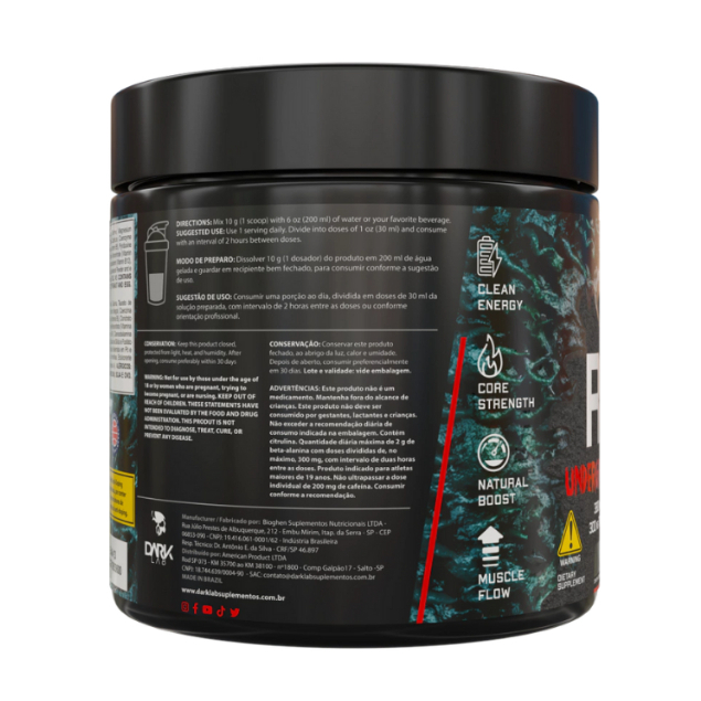 Descrição Raze Underground - Pré-Treino Extremo da Dark Lab (Stim free) Prepare-se para um novo nível de energia, resistência e foco. O Raze Underground Pre Workout da Dark Lab é a escolha ideal para atletas que não se contentam com o básico. Sem cafeína e com uma fórmula explosiva que combina 3810 mg de L-Arginina, 2000 mg de Beta-Alanina, 1000 mg de Taurina e 300 mg de L-Tirosina, este pré-treino foi desenvolvido para intensificar seus treinos, melhorar a vascularização, aumentar o foco mental e reduzir a fadiga muscular. Raze entrega uma performance limpa e poderosa, com ativos que estimulam a produção de óxido nítrico e favorecem o transporte de nutrientes para os músculos. Ideal para quem busca crescimento muscular, mais força e foco absoluto durante os treinos. BENEFÍCIOS DO RAZE UNDERGROUND: Aumento da energia limpa e resistência física; Potencializa o desempenho nos treinos com suporte à vasodilatação; Estimula a concentração mental e clareza cognitiva; Fórmula com coenzima Q10, vitaminas do complexo B e colostro bovino. QUALIDADE DARK LAB: Ingredientes de alta pureza e eficácia comprovada; Sem glúten e com ingredientes cuidadosamente selecionados; Produzido com padrão internacional de qualidade. MODO DE PREPARO: Dissolver 10 g (1 scoop) do produto em 200 ml de água gelada. Armazenar em recipiente bem fechado. Consumir conforme a sugestão de uso. SUGESTÃO DE USO: Consumir 1 porção ao dia, dividida em doses de 30 ml da solução preparada, com intervalos de 2 horas entre as doses ou conforme orientação de profissional habilitado. INGREDIENTES ATIVOS EM DESTAQUE: L-Arginina (3810 mg): promove vasodilatação e melhora o transporte de oxigênio e nutrientes; Beta-Alanina (2000 mg): reduz a fadiga muscular e melhora a resistência; Taurina (1000 mg): estimula o sistema nervoso e reduz o estresse oxidativo; L-Tirosina (300 mg): melhora o foco mental e desempenho cognitivo; Coenzima Q10 e Vitaminas do Complexo B: suporte antioxidante e energético. Colostro Bovino: rico em fatores de crescimento, aminoácidos e imunoglobulinas, auxilia na recuperação muscular, no fortalecimento do sistema imunológico e no ganho de massa magra. CONSERVAÇÃO E ADVERTÊNCIAS: Conservar o produto fechado, ao abrigo da luz, calor e umidade. Após aberto, consumir preferencialmente em até 30 dias. Este produto não é um medicamento. Não consumir se for gestante, lactante ou menor de 19 anos. Contém lactose. Pode conter derivados de leite, amendoim, soja e ovo. Não contém glúten.