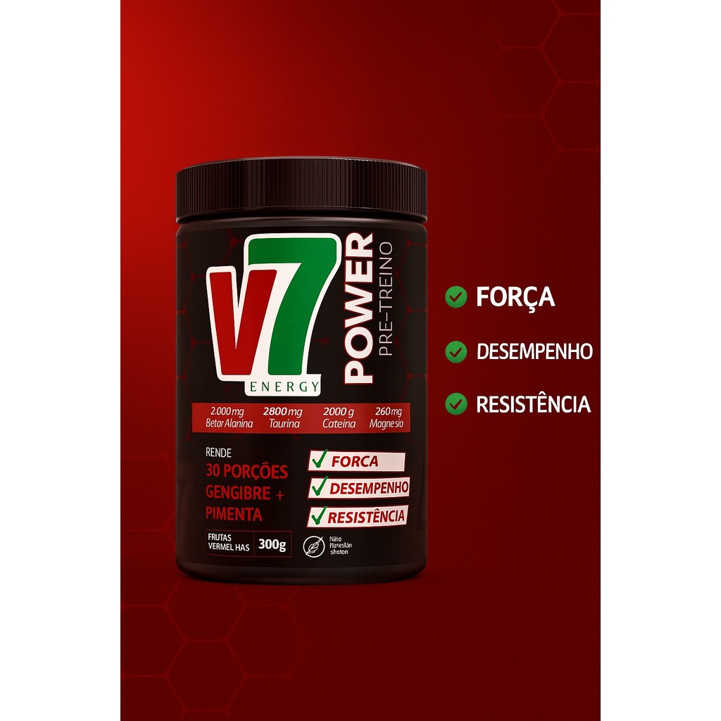 O V7 Energy Power é um pré-treino potente e completo, desenvolvido para quem busca mais força, resistência e desempenho nos treinos. Sua fórmula avançada combina ingredientes estratégicos como beta-alanina, cafeína, taurina e magnésio, além de gengibre e pimenta, que ajudam a ativar o metabolismo. Tudo isso com um sabor delicioso de frutas vermelhas! Benefícios: ✅ Aumenta a energia e o foco durante os treinos ✅ Contribui para resistência física e muscular ✅ Estimula o metabolismo com gengibre e pimenta ✅ Rico em ativos como taurina, cafeína e magnésio ✅ Fórmula zero glúten ✅ Rende 30 porções ℹ️ Ficha Técnica: ✅ Produto: Pré-Treino V7 Energy Power ✅ Sabor: Frutas Vermelhas ✅ Peso Líquido: 300g ✅ Rendimento: 30 porções ✅ Principais ativos por dose: ✅ 2000 mg de Beta-Alanina ✅ 2000 mg de Taurina ✅ 200 mg de Cafeína ✅ 260 mg de Magnésio ✅ Adição de Gengibre + Pimenta ✅ Não contém glúten