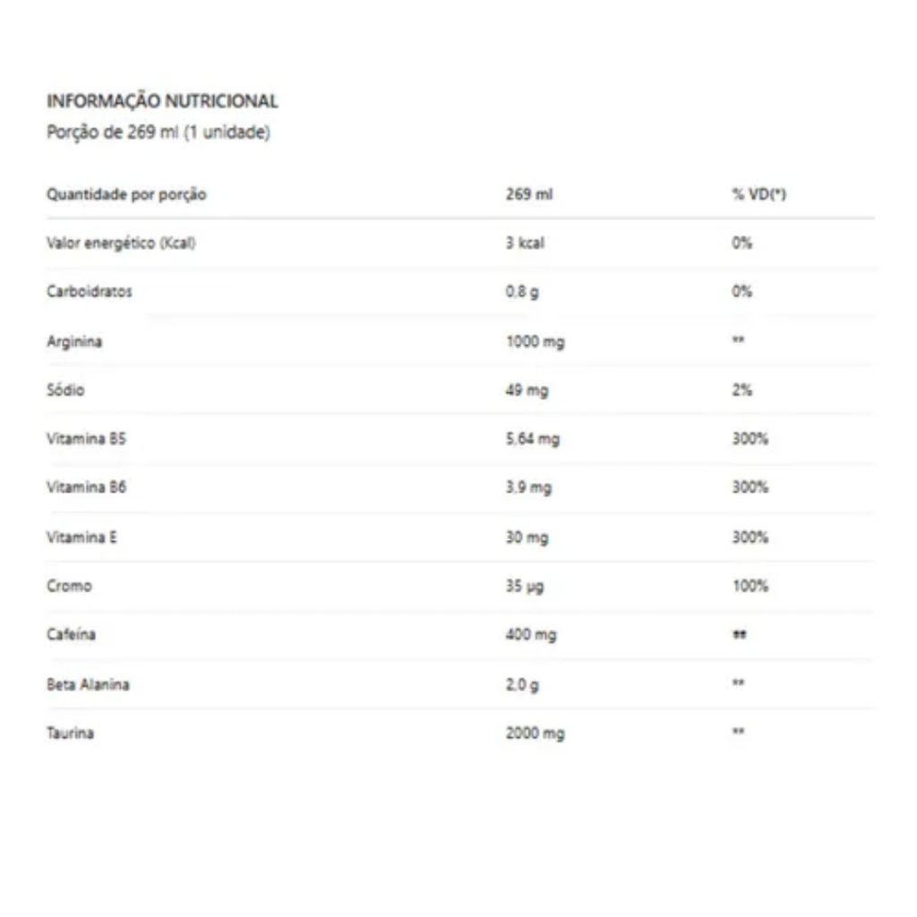 O V9 Pump da Shark Pro é uma excelente opção para quem busca mais energia, foco e desempenho nos treinos. Com uma fórmula potente e equilibrada, oferece praticidade e ação rápida, sendo ideal para atletas e praticantes de atividade física que desejam potencializar seus resultados. ------------------------------- COMO CONSUMIR ------------------------------ Consumir 1 unidade (269ml) cerca de 30 minutos antes do treino ou conforme recomendação de nutricionista ou médico. --------------------- BENEFÍCIOS --------------------- 2000 mg de beta-alanina por dose, contribuindo para o aumento da resistência muscular; 1000 mg de L-arginina, que auxilia na vasodilatação e melhora o fluxo sanguíneo; 2000 mg de taurina, importante para a contração muscular e função neuromuscular; 400 mg de cafeína, estimulante que promove energia, foco e disposição; Fórmula líquida de rápida absorção; Produto pronto para consumo, ideal para o dia a dia agitado. -------------------- Alergênicos ------------------- Não contém glúten. Pode conter traços de derivados de leite, soja e ovos. -------------------- Ingredientes -------------------- Água, beta-alanina, L-arginina, taurina, cafeína anidra, acidulante ácido cítrico, aroma idêntico ao natural de cola, conservadores benzoato de sódio e sorbato de potássio, edulcorantes sucralose e acessulfame de potássio, corante caramelo IV. --------------------- Advertências --------------------- Este produto não deve ser consumido por gestantes, lactantes, crianças, pessoas com sensibilidade à cafeína ou portadores de doenças pré-existentes sem orientação médica. Não exceder a dose recomendada. Mantenha fora do alcance de crianças. Conservar em local seco, fresco e ao abrigo da luz solar direta. Após aberto, consumir imediatamente.