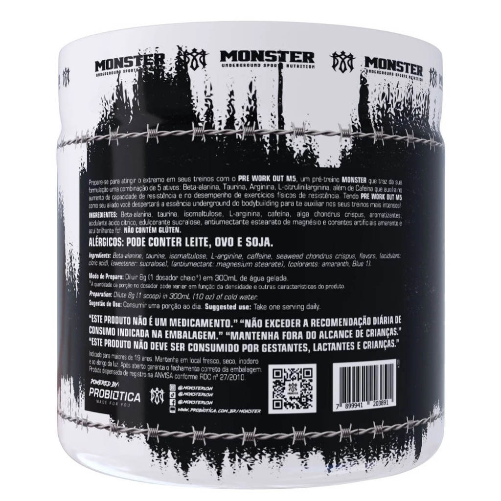 Pre Work Out M5 Pote 300g Probiótica – Frutas Vermelhas Sobre o produto: O Pre Work Out M5 da Probiótica é um pré-treino desenvolvido para quem busca máxima intensidade nos treinos. Sua fórmula reúne cinco ingredientes ativos — beta-alanina, taurina, arginina, L-citrulinilarginina e cafeína — em doses eficazes para promover mais energia, foco e resistência. A cafeína presente auxilia no aumento da capacidade de resistência e no desempenho durante exercícios físicos intensos. Ideal para quem pratica musculação, esportes de alta exigência e treinos de alta performance. Como consumir: Diluir 8g (1 dosador cheio) em 300mL de água gelada. Consumir uma porção ao dia, ou conforme orientação de profissional habilitado. Benefícios: • 2g de beta-alanina por porção • 1.200mg de taurina • 1.000mg de arginina • 4mg de L-citrulinilarginina • 200mg de cafeína: auxilia no aumento da resistência e desempenho físico Alergênicos: Pode conter leite, ovo e soja. Não contém glúten. Ingredientes: Sabor Frutas Vermelhas: Beta-alanina, taurina, isomaltulose, L-arginina, cafeína, alga Chondrus crispus, aromatizantes, acidulante ácido cítrico, edulcorante sucralose, antiumectante estearato de magnésio e corantes artificiais amaranto e azul brilhante FCF. Advertências: - Este produto não é um medicamento. - Não exceder a recomendação diária de consumo indicada na embalagem. - Mantenha fora do alcance de crianças. - Não deve ser consumido por gestantes, lactantes e crianças. Conclusão: O Pre Work Out M5 Probiótica é uma escolha robusta para quem deseja potencializar seus treinos com mais energia, foco e desempenho. Com ativos comprovados e alta concentração de ingredientes, é ideal para atletas e praticantes avançados que buscam uma performance superior nos treinos.