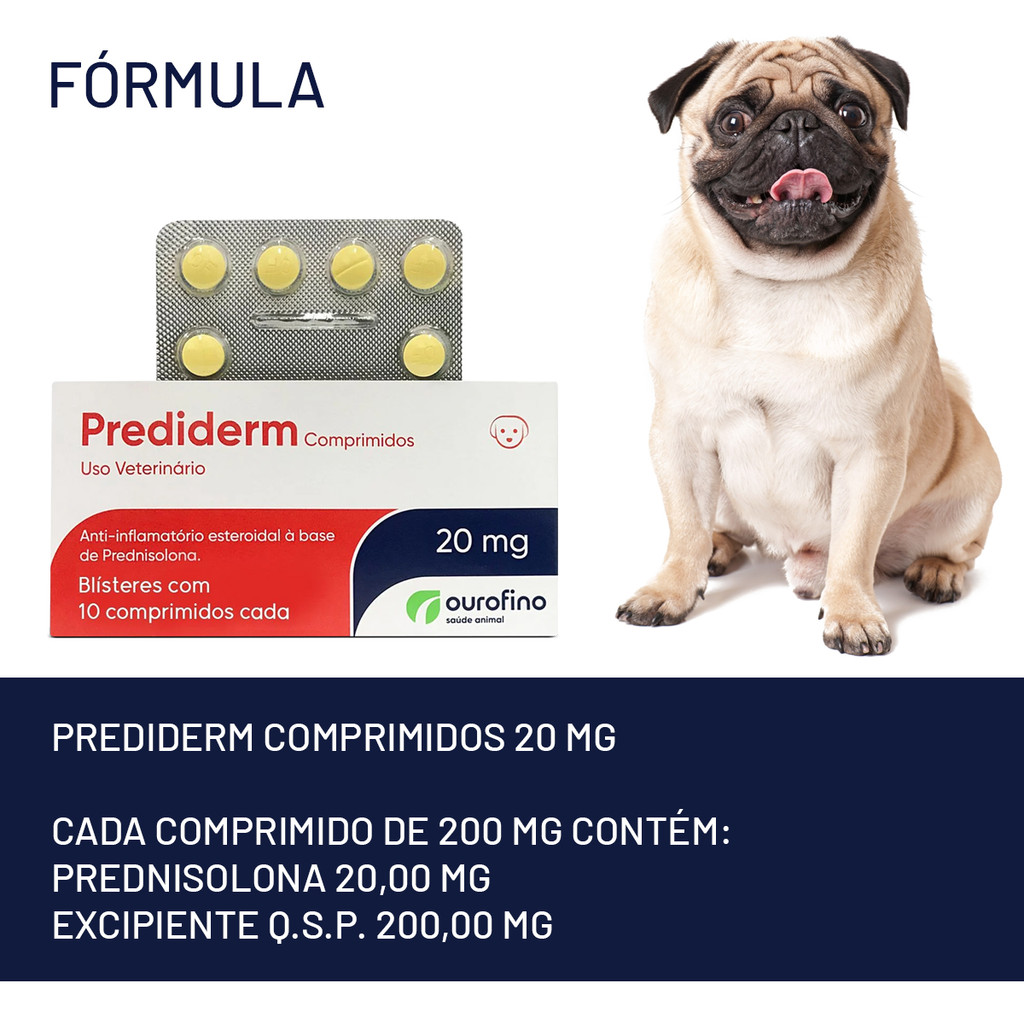Prediderm Tratamento eficaz contra os processos inflamatórios. Indicações: Prediderm Comprimidos é uma Prednisolona, potente anti-inflamatorio esteroide. A Prednisolona é um glicocorticoide que apresenta maior potencia anti-inflamatoria (de 3 a 5 vezes mais potente do que o cortisol) e menor efeito mineralocorticoide (50% menos atividade mineralocorticoide do que o cortisol), o que resulta em menor retenção de sódio e agua pelo organismo do animal, minimizando o risco de efeitos colaterais, como edema e hipertensão, comuns em terapias com esteroides. Prediderm Comprimidos? é indicado para cães com patologias de caráter inflamatório ou que se beneficiam com a ação metabólica da Prednisolona. Modo de uso e dosagens: O efeito terapêutico satisfatório de Prediderm Comprimidos, assim como com outros corticosteroides, ocorre com a individualização da dosagem de acordo com a gravidade da doença, duração prevista para o tratamento e resposta individual do animal e terapia. A administração de Prediderm Comprimidos deve ser calculada com o objetivo de se obter a menor dosagem possível que resulte no máximo efeito terapêutico desejado, com mínimos efeitos colaterais. As recomendações de dose que se seguem são baseadas na dosagem média diária total e contemplam as principais indicações de Prediderm Comprimidos, devendo ser usadas apenas como referência. A terapia com Prediderm Comprimidos deve ser iniciada com uma dose mais alta que a mantida até que se consiga a resposta terapeutica desejada, o que normalmente ocorre num período de 2 a 7 dias na maioria das patologias. Tão logo uma resposta clinica satisfatória tenha sido obtida, a dose diria deve ser reduzida gradualmente para a finalização do tratamento, nos casos de doenças agudas. Nos casos de doenças crônicas, reduz-se gradativamente a dose inicial até uma mínima dose efetiva de manutenção. Recomenda-se, nestes casos, a administração de Prediderm Comprimidos em dias alternados, pois este regime de administrativo permite a recuperação do eixo hipotalamo-hipafise-adrenal, minimizando o aparecimento de efeitos colaterais. A dose de manutenção deve ser ajustada periodicamente de acordo com as flutuações da atividade da doença e do estado geral do animal? O intervalo entre as doses, bem como a duração do tratamento, variam de acordo com a patologia a ser tratada. Formula: Prediderm Comprimidos 20 mg Cada comprimido de 200 mg contém: Prednisolona 20,00 mg Excipiente q.s.p. 200,00 mg