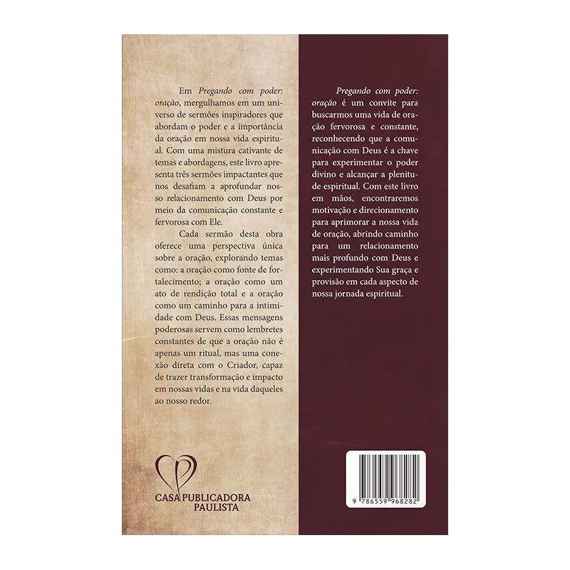 Em Pregando com poder: oração, mergulhamos em um universo de sermões inspiradores que abordam o poder e a importância da oração em nossa vida espiritual. Com uma mistura cativante de temas e abordagens, este livro apresenta três sermões impactantes que nos desafiam a aprofundar nosso relacionamento com Deus por meio da comunicação constante e fervorosa com Ele. Cada sermão desta obra oferece uma perspectiva única sobre a oração, explorando temas como: a oração como fonte de fortalecimento; a oração como um ato de rendição total e a oração como um caminho para a intimidade com Deus. Essas mensagens poderosas servem como lembretes constantes de que a oração não é apenas um ritual, mas uma conexão direta com o Criador, capaz de trazer transformação e impacto em nossas vidas e na vida daqueles ao nosso redor. Pregando com poder: oração é um convite para buscarmos uma vida de oração fervorosa e constante, reconhecendo que a comunicação com Deus é a chave para experimentar o poder divino e alcançar a plenitude espiritual. Com este livro em mãos, encontraremos motivação e direcionamento para aprimorar a nossa vida de oração, abrindo caminho para um relacionamento mais profundo com Deus e experimentando Sua graça e provisão em cada aspecto de nossa jornada espiritual. 14x21cm 112 Páginas