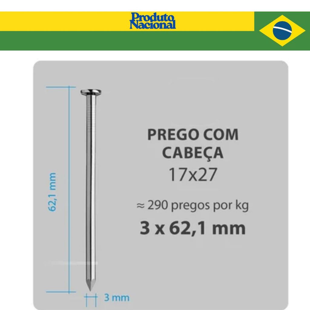 Sobre o ENVIO: - ENVIO EM ATÉ 36 HORAS. - ENVIAMOS PARA TODO O BRASIL. - AVALIAÇÃO MÉDIA DE 4,9 ESTRELAS. - ACOMPANHA NOTA FISCAL E EMBALAGEM DO PRODUTO. - EMPRESA COM CREDIBILIDADE, ATUANDO HÁ MAIS DE 15 ANOS NO MERCADO. - FOTOS REAIS (FOTO DE ACORDO COM O QUE É O PRODUTO, SEM ENGANAÇÕES!). - ATENDIMENTO HUMANIZADO E FOCADO EM ATENDER AS EXPECTATIVAS DE NOSSOS CLIENTES. LINK DAS DEMAIS MEDIDAS: https://shopee.com.br/product/1553157072/58204329665/ ******************DESCRIÇÃO*********************** O Prego Polido 17x27 ou 18cx36 com Cabeça é produzido pela empresa nacional ARAMESUL, utilizando técnicas avançadas e materiais de alta qualidade. Cada prego é submetido a rigorosos testes de resistência e durabilidade, atendendo aos mais altos padrões de qualidade. Optar pelo Prego Polido ARAMESUL significa escolher um produto nacional que contribui para o desenvolvimento econômico do país, com controle rigoroso de todo o processo produtivo, desde a seleção dos materiais até o acabamento final. O Prego Polido 17x27 ou 18x36 com Cabeça é ideal para uma variedade de aplicações, incluindo: 1 - Construção de estruturas: Utilizado na construção de vigas, pilares, treliças e telhados, oferecendo estabilidade e segurança. 2 - Fixação de tábuas e painéis: Empregado em trabalhos de carpintaria e marcenaria para fixar tábuas, painéis e outros elementos de madeira, garantindo a integridade das peças. 3 - Montagem de móveis e estruturas de madeira: Fornece uma união estável entre as peças, tornando-as duráveis e resistentes a forças externas. 4 - Projetos de artesanato: Utilizado na montagem de esculturas, peças decorativas ou outros objetos de madeira, com fixação segura. Quantidade de Pregos Aproximado: 500g de 17x27 = 120 pregos 1kg de 17x27 = 240 pregos 500g de 18x36 = 83 pregos 1kg de 18x36 = 166 pregos
