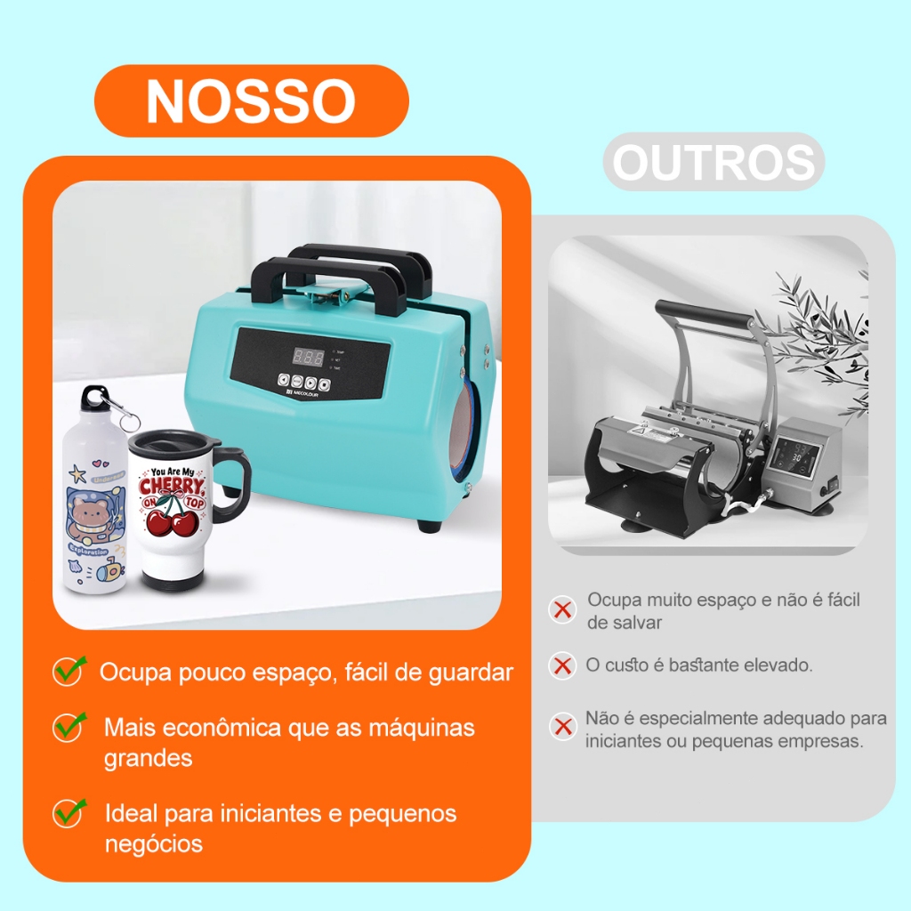 🌷Bem-vindo à nossa loja🌷 Estamos envolvidos no setor de transferência de calor há mais de dez anos e somos vendedores locais no Brasil. A qualidade do produto é garantida. Prensa Térmica para Sublimação em Canecas Squeezes Copos Mecolour Acompanha Resistência de 22OZ(110v de cabo branco e 220v de cabo preto ) Este produto é a combinação perfeita pois sublima e trabalha através da técnica de transferência. Agora o seu limite é a sua imaginação, imprima todos os tipos de objetos e superfícies. É definitivamente uma ferramenta versátil para usar em casa ou desenvolver um empreendimento. Além disso, é uma técnica fácil de aprender com muitas opções de implantação. O que você está esperando? Sua criatividade não tem limites. -Compacta de fácil manuseio e leve -Aviso sonoro quando a sublimação é terminada -Visor digital com timer e temperatura -Ajuste de temperatura de 1°C em 1°C -Alavanca de alta pressão Indicada para confecção de brindes e eventos para produtos personalizados Marca:Mecolour Modelo: A180/A181 Prensa Térmica para personalização de Canecas Squeezes Copos Cilíndricas Voltagem:110v ou 220v (faça a escolha da voltagem na hora da compra) Potência:500w Temperatura:0-200°C Tempo para configuração:0-999s Aera para impressão:22Oz Peso Bruto/Liquido:5,90kg/4,90kg 🌷Dicas para estampar: Antes de estampar, limpe a superfície do seu produto com uma flanela seca para retirar possíveis poeiras e resíduos; Deixe o papel impresso em contato com um pouco de calor da prensa para retirar possível umidade do tempo; Centralize bem o desenho e prenda com uma etiqueta adesiva (sugerimos aquelas etiquetas térmicas, que não deixam resíduo de cola no produto estampado); Não queime a estampagem - siga adequadamente modo de tempo e temperatura. 🌷Garantia do vendedor: 3 meses 📌Obrigado por comprar em nossa loja. Siga-nos para mais promoções atualizadas! 📌Se você tiver algum problema com o produto, entre em contato conosco a tempo! 📌Para devoluções e reembolsos, envie-nos vídeos ou fotos de unboxing para nossa análise. Obrigado novamente por sua compra e desejo a você uma vida feliz!