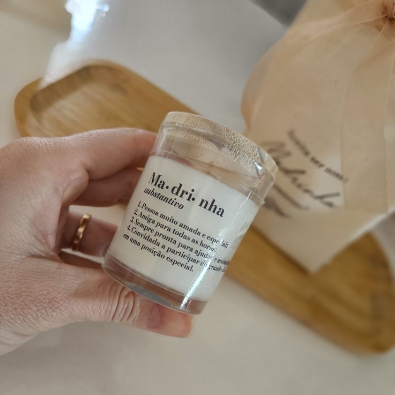 Kit vela70g com sacola mini ecobag algodão Padrinhos de Casamento Descrição: Surpreenda seus padrinhos com nosso kit pronto entrega, que inclui uma vela exclusiva de 70g: uma com o substantivo "Padrinho" ou "Madrinha". Cada vela é perfumada com aroma suave de lavanda ou capim limão (conforme disponibilidade), proporcionando um toque especial e acolhedor. O que está incluso: - 01 Vela Aromatizada: Cera vegetal de alta qualidade, queima limpa e fragrância delicada. - Sacola Mini Ecobag de Algodão: Com um convite personalizado impresso: "Aceita ser nossa MADRINHA ou PADRINHO?", adornada com um laço delicado de voal, que traz elegância e charme à lembrança. ESCOLHA ENTRE A VARIAÇÃO DISPONÍVEL Destaques: - Praticidade: Produto pronto para entrega. - Design Exclusivo: Velas com nomes específicos para padrinho e madrinha. - Toque especial: Sacola com convite e acabamento delicado. Garanta já este kit único e encante quem fará parte do seu momento mais especial!