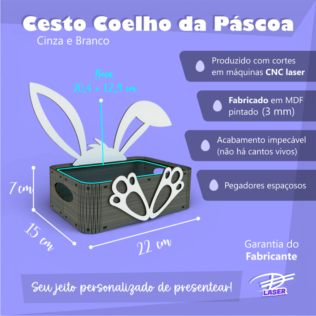 Um presente criativo, elegante e super versátil. Surpreenda nesta Páscoa com uma cesta temática lúdica e charmosa, perfeita para montar kits de chocolates, bombons e lembranças. O design “coelhinho escondido” cria um visual encantador que chama atenção nas fotos e valoriza seu presente. DESTAQUES DO PRODUTO: - Design exclusivo: orelhas grandes e recortes de patas de coelho na frente, efeito 3D super dinâmico. - Acabamento premium: madeira MDF com textura cinza e bordas arredondadas para um toque moderno. - Versátil: ideal para presentear, decorar mesas, montar cestas de doces ou brindes corporativos. - Durável e reutilizável: estrutura firme para usar o anotodo como organizador/centro de mesa. - * - Não acompanha doces. Envio apenas do Cesto Coelho. COMO USAR: Monte sua seleção de doces (barras de chocolate, mini chocolates, ovinhos, balas e mimos), forre com papel seda para um presente elegante e econômico. FICHA TÉCNICA: - Tema: Páscoa / Coelho / Feliz Páscoa. - Tipo: Cesta decorativa / organizador. - Estilo: Cartoon, moderno e lúdico. - Material: MDF 3 mm. - Cor/Acabamento: cinza texturizado (base) com apliques brancos (orelhas e patas). - Formato: Retangular com cantos arredondados. Possui alças. - Produção: Corte a laser (alta precisão). - Montagem: produto enviado montado (montagem artesanal). Apenas as orelhas vão desmontadas na embalagem para proteger no transporte e facilitar o envio. - Uso: Decoração + presente + lembrancinha + caixa de mimos + corporativo MEDIDAS: - Cesto: 7 cm (A) x 22 cm (L) x 15 cm (C) - Cesto com orelhas e patas: 21cm (A) x 32,4 cm (L) x 15 cm (C) CONTEÚDO DA EMBALAGEM: - A escolher variação: 1 (uma) cesta temática coelho. OBSERVAÇÕES: a) A tonalidade do produto pode variar de acordo com a resolução da tela. b) Os objetos que ambientam as fotos não acompanham o produto. c) Cuidados especiais: não deixar em contato direto com a água, limpar somente com um pano levemente umedecido. d) Caso tenha algum problema após a sua compra, conte com a nossa equipe de pós-venda para solucionar com a maior agilidade. e) Utilizamos o emissor de Nota Fiscal automático da plataforma, portanto não temos como alterar nenhum dado. Tanto a nota fiscal como a etiqueta de envio, serão conforme as informações cadastradas e confirmadas pelo comprador no momento da compra. f) Não é emitido nota fiscal para terceiros. g) Todas as fotos são de produtos reais e de exclusividade da DF LASER, sendo assim o uso não autorizado das imagens poderá acarretar punições de acordo com a lei de direitos autorais. GARANTIA: Garantia de 7 dias contra defeito de fabricação; Executar a conferência no ato do recebimento. Seu produto é extremamente bem embalado para que não ocorra nenhum contratempo durante o processo de entrega e assim o receba perfeitamente como saiu de fábrica. Se o produto chegar danificado garantimos a troca sem custo algum aos nossos clientes. Fabricante: DF LASER. cesta páscoa, cesta pascoa, cesta coelho, cesto coelho, cesta mdf, caixa páscoa, caixa pascoa, cesta decorativa, cesta presente, cesta chocolates, cesta temática, kit páscoa, lembrancinha páscoa, organizador mdf, caixa decorativa, presente páscoa, decoração páscoa, mesa posta páscoa, lembrança páscoa escola, cesta páscoa empresa, brinde páscoa, kit doces páscoa, montagem de cesta páscoa, cesta para ovinhos, cesta para bombons