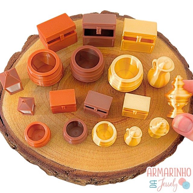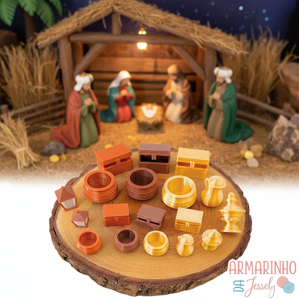 Presente dos Reis Magos – Design Exclusivo Encantador e simbólico, o Presente dos Reis Magos é perfeito para compor cenários natalinos, presépios e decorações temáticas. Inspirado nos tradicionais presentes ofertados a Jesus, este kit traz peças cheias de significado e detalhes delicados que valorizam ainda mais sua montagem. TAMANHOS: BAU (1,9 x 2,0 x 3,0 cm) // JARRO (3,5 x 2,0 x 2,0 cm) // TURIBULO (3,5 x 2,5 x 2,5 cm) // LAMPARINA (2,6 x 2,6 x 1,6 cm) KIT CONTÉM: 4 Peças. (1 LAMPARINA, 1 JARRO, 1 TURIBULO e 1 BAU DO TESOURO OU POTE DE OURO) SELECIONE BEM O MODELO (cada modelo copõem um kit de cores, variando o BAU DO TESOURO ou POTE DE OURO) Indicado para Amigurumis de 18 a 24 cm Conteúdo da embalagem: 1 kit completo na variação escolhida Material: PLA (plástico biodegradável) Informações importantes: Produto feito em impressora 3D, podendo apresentar pequenas variações de cor entre as unidades devido ao lote do filamento. É normal que haja leves marquinhas ou linhas características do processo de impressão 3D. Resistência térmica do material: até 60 °C. As cores podem variar de acordo com o dispositivo ou tela utilizada.