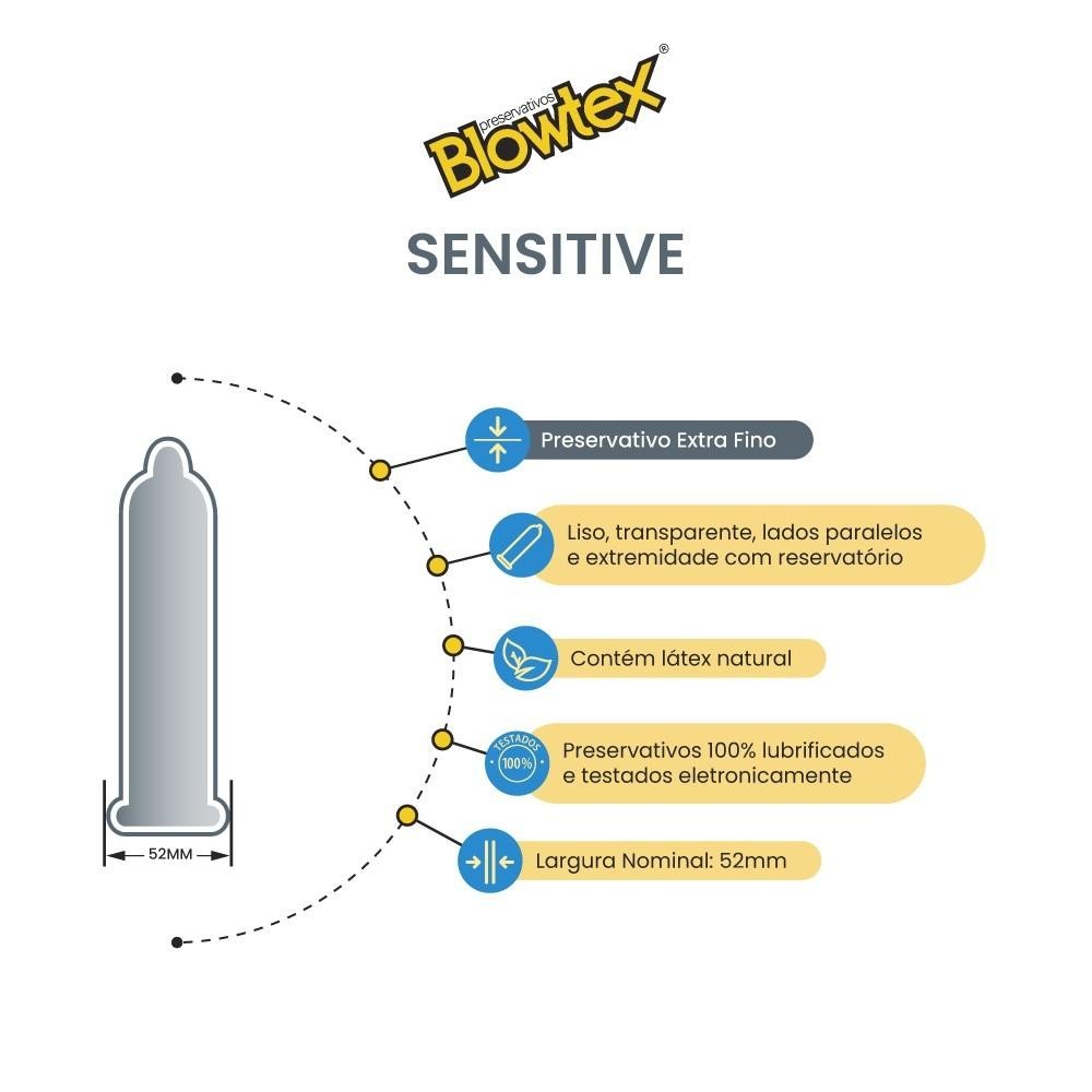 Blowtex Sensitive é um preservativo extra fino que permite sentir muito mais o parceiro durante a relação sexual. Conheça Blowtex® Blowtex é uma tradicional marca de preservativos presente no mercado brasileiro há mais de 25 anos e com produtos para todos os gostos. Produzidos com qualidade para atender todos os requisitos estabelecidos pela normatização técnica vigente, os produtos Blowtex são 100% lubrificados e testados eletronicamente, além de oferecer uma variedade de opções que promovem uma relação íntima muito mais divertida e prazerosa. Além do tradicional Blowtex Lubrificado, a marca conta também com opções saborizadas (Blowtex Morango, Blowtex Morango com Chocolate, Blowtex Menta, Blowtex Uva Verde, Blowtex Tutti Frutti e Blowtex Twist), com efeito retardante ou texturizadas (Blowtex Prazer Prolongado, Blowtex Action e Blowtex Orgazmax+), versões extra finas (Blowtex Zero e Blowtex Sensitive Super Aloe Vera) ou com benefício diferenciado (Blowtex Hot e Blowtex Extra Grande). Experimente a linha Blowtex completa e encontre a sua preferida! Para que serve Blowtex® Os preservativos BLOWTEX® LUBRIFICADO SENSITIVE destinam-se a recobrir o pênis ereto durante a relação sexual, auxiliando na prevenção de doenças sexualmente transmissíveis e no planejamento familiar. Características •Produto: Blowtex Sensitive •Marca: Blowtex® •Disponível em versão com 03 undades •Largura Nominal: 52mm •Liso, transparente, lados paralelos e extremidade com reservatório •Material: contém látex natural •100% lubrificados e testados eletronicamente •Composição: Látex de borracha natural e óleo de silicone (lubrificante)