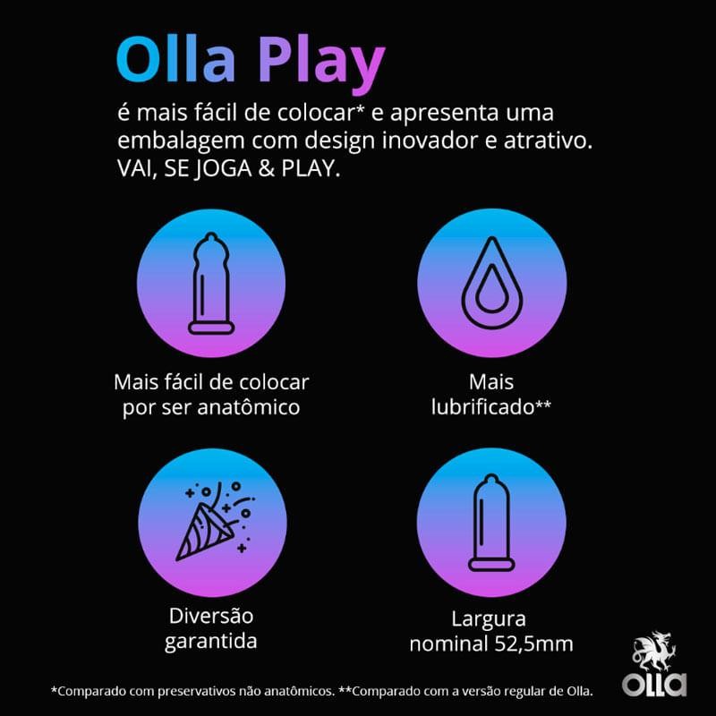Olla, a marca líder em bem estar sexual, lança sua última inovação: O Preservativo Olla Play. Com benefícios diferenciados, Olla Play é mais fácil de colocar e apresenta uma embalagem com design inovador e atrativo. Aproveite o momento e desça pro Play. Durante a relação sexual, o preservativo é o único método eficaz para evitar a gravidez indesejada e doenças sexualmente transmissíveis (DST), inclusive a AIDS.