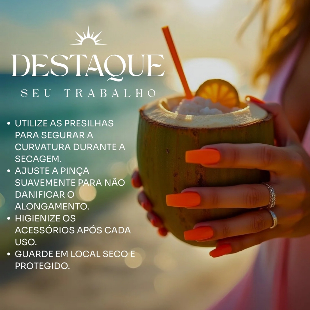 Acompanha: 6/12/24/48 - Presilhas para Curvatura C 01 - Pinça para Curvatura C As cores e modelos serão enviados conforme a disponibilidade em estoque! Apresentação do Kit: Kit profissional desenvolvido para auxiliar na formação da curvatura C durante o alongamento de unhas. As presilhas garantem pressão uniforme, enquanto a pinça oferece controle preciso para um acabamento simétrico e bem definido. Principais Utilizações: - Formação da curvatura C - Uso em unhas de gel, acrílico ou polygel - Padronização do formato das unhas - Uso profissional em nail design - Agilidade no processo de construção Detalhes do Produto: - Capacidade: Uso individual (reutilizável com higienização adequada) - Cor: Enviada conforme disponibilidade - Presilhas: Plástico resistente para pressão uniforme - Pinça: Estrutura metálica para ajuste preciso Cuidados e Recomendações: - Higienizar antes e após cada uso - Utilizar no ponto correto de cura do produto - Evitar excesso de pressão para não deformar a unha - Armazenar em local seco e organizado - Indicado para uso profissional