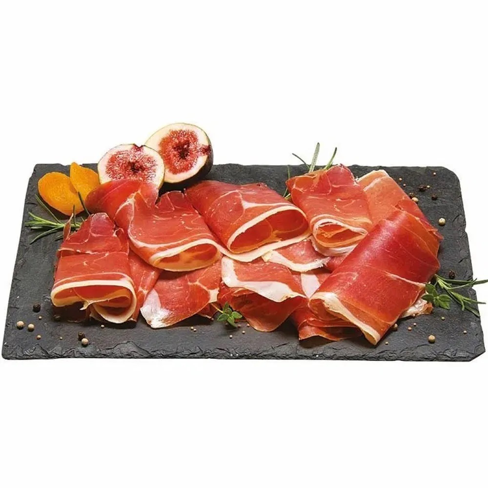 Presunto Espanhol Fatiado Cartela 100g O Presunto Jamón Serrano é um presunto curado de origem espanhola que se destaca pelo seu sabor rico e característico. Produzido a partir de pernas traseiras de porcos cuidadosamente selecionados, o Jamón Serrano passa por um processo de salga e cura lenta, resultando em uma carne de alta qualidade e sabor excepcional.