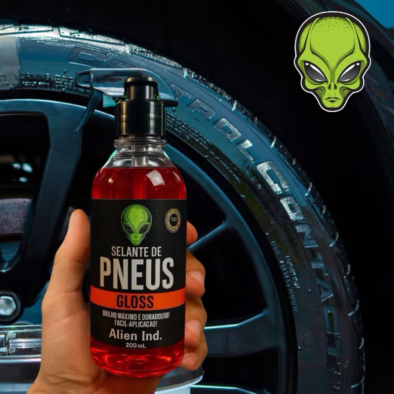 O MELHOR SELANTE DE PNEUS DO MERCADO! O selante de pneus Alien Ind. foi desenvolvido para os amantes de carros, que buscam um produto de ótima qualidade com grande rendimento, garantindo um efeito de brilho molhado intenso. Resiste à água e dura até 60 dias. Não deixa melado,não atrai insetos. Hidrata a borracha e tem proteção UV. Rende aproximadamente 12 aplicações completas em pneus de tamanho padrão. ( aros 13 à 15). Modo de uso: Limpe bem os pneus, retire os resíduos e silicones que venham a ter e espere secar, aplique o selante usando um aplicador ou esponja, aguarde secar (cerca de 40 minutos), para mais brilho, aplique mais uma demão. Ideal que antes de molhar, aguarde algumas horas para obter a selagem completa. Frasco com 200ML. Envio imediato!