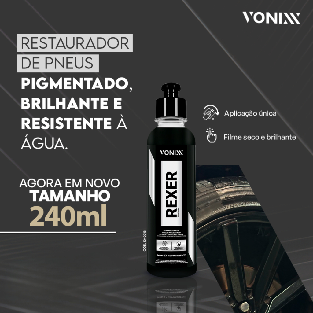 RESTAURADOR PIGMENTADO REXER 240ML 1 - RESTAURADOR DE PNEU REXER 240ML VONIXX 1 - ESPUMA AZUL -------------------------------------------------------------------------------------------------- RESTAURADOR DE PNEU REXER 240ML VONIXX Se você procura aquele acabamento perfeito para os pneus do seu carro, com brilho intenso, pigmentação duradoura e alta resistência à água, o REXER da Vonixx chegou para revolucionar sua garagem! PRINCIPAIS VANTAGENS: - Pigmentado e Brilhante – Realça a cor preta dos pneus, deixando um aspecto renovado e sofisticado. - Resistente à Água – Proteção duradoura mesmo em dias de chuva ou lavagens. - Aplicação Única – Fórmula prática que facilita o uso e garante ótimo rendimento. - Filme Seco e Brilhante – Pneus bonitos sem aquele aspecto grudento ou oleoso. MODO DE USO: - Lave bem os pneus e aguarde a secagem. - Aplique o produto com aplicador. - Espalhe de maneira uniforme até formar o acabamento desejado. - Deixe secar naturalmente para obter o brilho máximo.