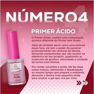 Primer Ácido Anylovy O Primer Ácido, contém uma composição química diferente do Primer sem Ácido. Além de também servir como uma película dupla face, ele tem o poder de penetrar de uma forma muito mais profunda nas ranhuras da lâmina, deixando componentes que vão auxiliar na aderência do seu produto, quebrando as moléculas de gordura, oleosidade e umidade de forma mais intensa. Por conter solventes e ácido, ele faz duas ações mútuas, reforçando a desidratação ao mesmo tempo que prepara o ambiente, deixando a lâmina mais sequinha ainda para receber o gel que vai vir logo por cima. Contém: 01 - Primer Ácido - Anylovy - 10ml