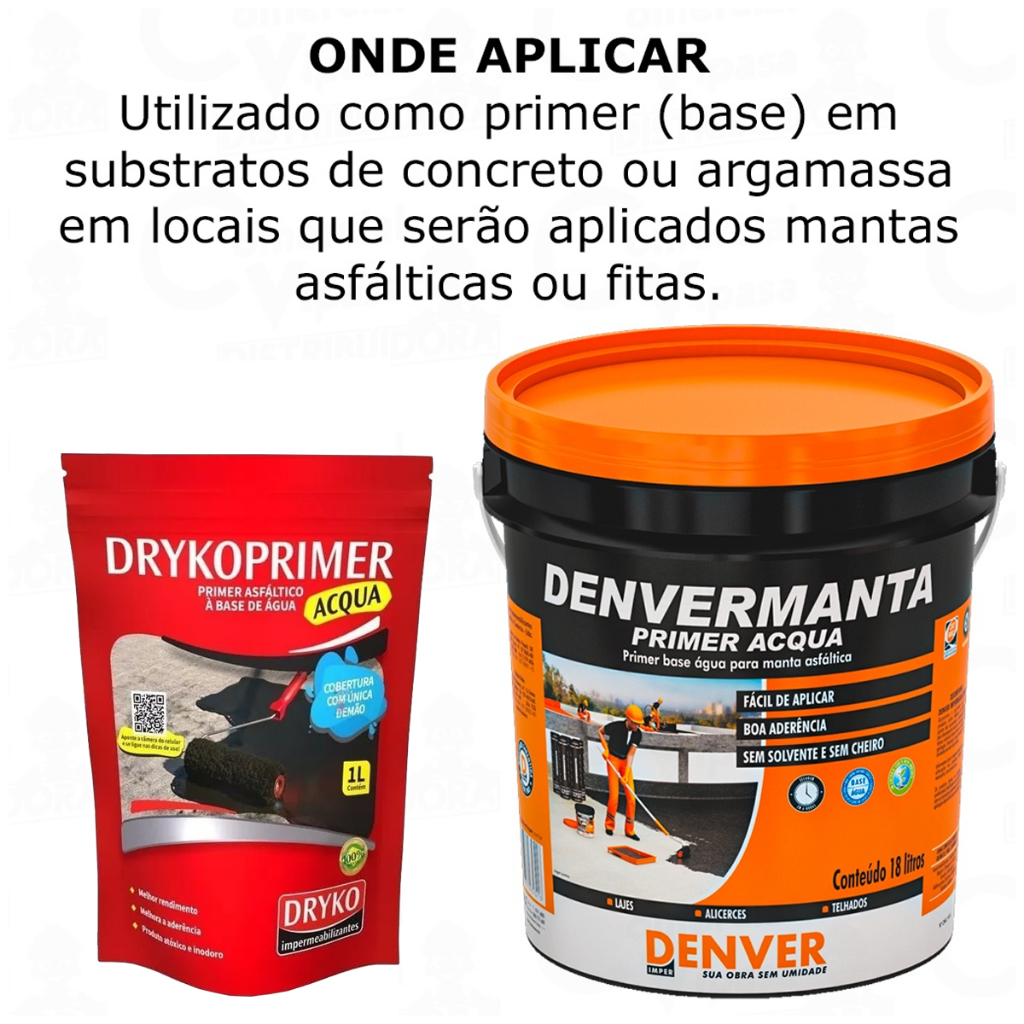 COMERCIAL VIPASA DISTRIBUIDORA. Primer Liquida 1L Ou 3,6 Litros Para Impermeabilizar Fita Manta Asfáltica Adesiva De Telhado Lajes Primer Manta Liquida 1L Ou 3,6 Litros Para Fita Asfáltica Adesiva De Telhado Marrom Escuro Primer Manta Liquida Asfáltico 1 L ou 3,6 Litros (emulsão Asfáltica) Descrição: Emulsão asfáltica composta de asfaltos especiais diluídos em água. Possui baixa viscosidade e alto teor de sólidos que, pela sua característica, garante uma cobertura com uma única demão, garantindo uma superfície que proporciona ótima aderência para o sistema impermeabilizante de base asfáltica. Onde aplicar: - Imprimação para mantas asfálticas; - Imprimação para mantas asfálticas; - Imprimação para emulsão e solução asfáltica Embalagem: - Pouch 1 Litro - Galão 3,6 Litros Aplicação do DRYKOPRIMER ACQUA: Misturar o produto antes de iniciar a aplicação. Para aplicação utilizar rolo de pintura, trincha e pincel. Com o substrato seco aplique em única demão o DRYKOPRIMER ACQUA puro e aguarde a secagem de 6 a 12 horas para aplicação do sistema de impermeabilização ou vedação asfáltico. Recomenda-se não aplicar o produto em tempo chuvoso e substrato molhado. Recomendamos a aplicação com temperatura entre 10 e 40 °C, e umidade relativa do ar inferior a 85%. concreto na área COMERCIAL VIPASA DISTRIBUIDORA.