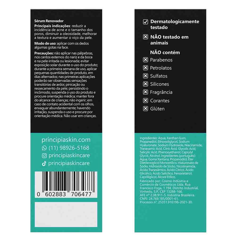 Kit com três fórmulas com alta eficácia anti-acne: um gel de limpeza com 11,5% de mix de tensoativos, 10% de glicerina e 1% de PCA sódio, com alta eficácia na melhora da oleosidade, poros dilatados e viço da pele. Indicado para peles sensíveis, um sérum com mix de 4 ativos com niacinamida + glicólico + tranexâmico + salicílico e um protetor solar fluido antioleosidade com mix de filtros UV + niacinamida, FPS 60, toque seco e com eficácia contra raios UVA e UVB. INDICAÇÕES Principais Controlar a oleosidade Diminuir cravos e espinhas Melhorar o viço Proporcionar maciez Proteger contra o sol Auxiliar na proteção contra a luz visível e luz azul Reduzir tamanho dos poros Remover impurezas Complementares Aumentar a firmeza e elasticidade Promover hidratação Reduzir e uniformizar a pigmentação Tipos de pele Sensível Todos MODO DE USO: Manhã: Lave o rosto com o gel de limpeza. Com a pele limpa e seca, aplique um hidratante facial e finalize com protetor solar. Noite: Lave o rosto com o gel de limpeza. Com a pele limpa e seca, aplique o sérum Mix-01, evitando as áreas ao redor dos olhos, finalize com hidratação facial. Inicialmente, use o sérum 3 vezes na semana, em noites alternadas, com intervalo de 2 noites entre as aplicações. Ir sentindo a tolerância da pele, aumente gradativamente as aplicações. Noite em que não fizer uso do sérum, mantenha a pele limpa e hidratada. INGREDIENTES ATIVOS GLICERINA Composto orgânico hidrofílico, considerado um dos mais eficazes umectantes utilizados em formulações para cuidados com a pele, proporciona hidratação devido sua capacidade de atrair e reter líquidos. Além da ação superficial, a Glicerina consegue penetrar na barreira cutânea, mantendo sua eficácia em camadas internas da pele durante vários dias. TENSOATIVOS Substâncias com capacidade de degradar e emulsificar gorduras e óleos, e suspender partículas sólidas, facilitando sua remoção com água, são amplamente utilizados em formulações para limpeza da pele. Existem vários tipos de tensoativos, sendo normalmente classificados como catiônicos, aniônicos, não-iônicos e anfóteros, em função das características dos íons que podem ser gerados quando essas substâncias estão em solução aquosa. PCA SÓDIO Umectante derivado do ácido glutâmico obtido através do melaço da cana-de-açúcar, está presente naturalmente na pele, ajudando a prevenir a perda de água e melhorando a hidratação da pele. NIACINAMIDA Forma estável de vitamina B3 capaz de entregar diversos benefícios para a pele, tais como redução de acnes e cravos e controle da oleosidade, comprovados em estudos publicados em diversos médico-científicos. É um precursora dos cofatores NADH (nicotinamida e adenina dinucleotídeo) e NADPH (fosfato de nicotinamida e adenina dinucleotídeo), que em suas formas reduzidas agem como coenzimas em dezenas de reações bioquímicas. ÁCIDO GLICÓLICO Derivado da cana de açúcar, é um alfa hidroxiácido de pequeno tamanho molecular que penetra na pele e estimula sua renovação celular, acelerando o processo de regeneração natural, promovendo uma esfoliação química, reduzindo o acúmulo de células mortas e ajudando a manter os poros livres. ÁCIDO TRANEXÂMICO Um derivado sintético do amino ácido lisina, atua em mecanismos que influenciam a pigmentação da pele, com eficácia comprovada em testes clínicos na redução de manchas escuras, inclusive as relacionadas a incidência de acnes e a exposição solar. ÁCIDO SALICÍLICO Beta-hidroxiácido com propriedades antibacterianas e antifúngicas, promove a esfoliação do estrato córneo, removendo células mortas, controlando a oleosidade e inibindo a incidência de acnes e cravos. Sua ação queratolítica também aumenta a permeabilidade da pele à outros ingredientes ativos. FILTROS UV Ingredientes que absorvem ou refletem raios UVA e UVB protegendo a pele contra danos causados pela exposição ao sol tais como aparecimento de manchas, queimaduras solares, envelhecimento prematuro e câncer de pele. DÚVIDAS FREQUENTES Contêm parabenos, petrolatos e sulfatos? Não. Suas composições também não incluem silicones.Contém sulfato no gel de limpeza. Estão regularizadas na Anvisa? Sim, todos os produtos são devidamente regularizados junto a Anvisa. Causa descamação da pele? Em geral, não provoca descamação visível da pele. Foram testadas em animais? Não. A PRINCIPIA não realiza testes em animais. Qual o prazo de validade? Três anos, contados da data de fabricação. Causa acnes ou cravos? Não. Pelo contrário, costumam ter efeitos benéficos e ser recomendadas para peles acnêicas. Garantia de fábrica: 30 dias
