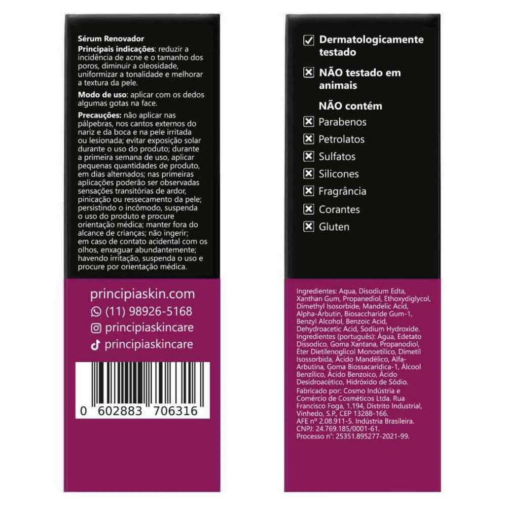 Kit anti-manchas essencial com quatro fórmulas: um gel de limpeza com mix de tensoativos + salicílico + glicerina, um sérum de ácido mandélico + alfa-arbutin, um sérum de niacinamida + zinco PCA e um protetor solar fluído FPS 60 + niacinamida, ação antioleosidade, toque seco e com eficácia contra raios UVA e UVB, luz visível e azul. INDICAÇÕES Principais »Diminuir cravos e espinhas »Reduzir e uniformizar a pigmentação »Controlar a oleosidade »Proporcionar maciez »Melhorar o viço »Remover impurezas Complementares »Promover hidratação »Aumentar a firmeza e elasticidade »Suavizar rugas e linhas finas »Diminuir olheiras e bolsas Tipos de pele »Todos MODO DE USO » Diariamente, aplique as fórmulas na seguinte sequência: Manhã: Gel de Limpeza > Niacinamida > Protetor Solar Noite: Gel de Limpeza > Niacinamida > Ácido Mandélico GL-01 (MIX DE TENSOATIVOS + ÁCIDO SALICÍLICO + GLICERINA) » Use todos os dias, de manhã e à noite » Aplique uma pequena quantidade na face úmida e massageie até fazer espuma, enxaguando em seguida AM-10 (ÁCIDO MANDÉLICO + ALFA-ARBUTIN) » Aplique em noites alternadas por uma semana, depois todas as noites » Use antes de cremes, protetor solar e maquiagem » Com o rosto limpo e seco, sem encostar a cânula da pele, dispense algumas gotas nos dedos ou diretamente na face » Espalhe suavemente pelo rosto, inclusive na área dos olhos Aplique na área dos olhos Nc-10 (NIACINAMIDA + ZINCO PCA) » Use diariamente, de manhã e à noite » Aplique antes de cremes, protetor solar e maquiagem » Deixe o rosto limpo e seco » Sem encostar a cânula da pele, dispense algumas gotas nos dedos ou diretamente na face » Espalhe suavemente pelo rosto, inclusive na área dos olhos Aplique na área dos olhos PS-01 (MIX DE FILTROS UV + NIACINAMIDA) » Use diariamente antes da exposição ao sol » Aplique abundantemente sobre a pele seca » Reaplique sempre após sudorese intensa, nadar ou banhar-se, secar-se com toalha e durante a exposição ao sol * GL-01 (MIX DE TENSOATIVOS + ÁCIDO SALICÍLICO + GLICERINA) » Evite contato com os olhos » Mantenha fora do alcance de crianças » Não use em crianças » Guarde em local fresco e seco * AM-10 (ÁCIDO MANDÉLICO + ALFA-ARBUTIN) » Não aplique nas pálpebras, nos cantos externos do nariz e da boca e na pele irritada ou lesionada » Evite exposição solar durante o uso do produto » Durante a primeira semana de uso, aplique pequenas quantidades de produto, em dias alternados » Nas primeiras aplicações poderão ser observadas sensações transitórias de ardor, pinicação ou ressecamento da pele » Havendo irritação, suspenda o uso e procure por orientação médica » Mantenha fora do alcance de crianças » Em caso de contato acidental com os olhos, enxague abundantemente » Guarde em local fresco e seco * Nc-10 (NIACINAMIDA + ZINCO PCA) » Evite contato com os olhos e exposição solar sem proteção » Mantenha fora do alcance de crianças » Guarde em local fresco e seco * PS-01 (MIX DE FILTROS UV + NIACINAMIDA) » Mantenha fora do alcance de crianças » Em caso de contato acidental com os olhos, enxaguar abundantemente » Havendo irritação, suspenda o uso e procure por orientação médica INGREDIENTES ATIVOS »NIACINAMIDA »ÁCIDO GLICÓLICO »ÁCIDO TRANEXÂMICO »ÁCIDO SALICÍLICO »GLICERINA »TENSOATIVOS DÚVIDAS FREQUENTES Contêm parabenos, petrolatos e sulfatos? Sua composição não contém parabenos, petrolatos, corantes, silicones, fragrância nem glúten. Contém sulfato apenas na formulação do GL-01. Estão regularizadas na Anvisa? Sim, conforme processos número 25351.094030-2022-33, 25351.895277-2021-99, 25351.641441-2022-21, 25351.511390-2020-41. Causa descamação da pele? Em geral, não provoca descamação visível da pele. Foram testadas em animais? Não. A PRINCIPIA não realiza testes em animais. Qual o prazo de validade? Três anos, contados da data de fabricação. Causa acnes ou cravos? Não. Pelo contrário, costumam ter e