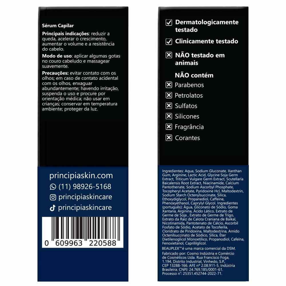 Kit com shampoo, condicionador e sérum antiqueda com alta eficácia na redução da quebra, estimulo do crescimento e aumento da resistência e volume dos cabelos. MODO DE USO » Use ao menos 3x por semana Shampoo » Aplique no couro cabeludo e cabelos úmidos, massageando delicadamente, deixe agir por 2 minutos e enxague Condicionador » Após o uso do Shampoo Antiqueda Principia AQ-01, aplicar nos cabelos úmidos distribuindo uniformemente do comprimento as pontas. Deixar agir por 1 minuto e enxaguar. Sérum Capilar » Use diariamente, de preferência à noite. Dispense algumas gotas no couro cabeludo, massageando suavemente. Evitar lavar o cabelo após a aplicação. AQ-01 (SHAMPOO + CONDICIONADOR) » Evite contato com os olhos » Em caso de contato acidental com os olhos, enxague abundantemente » Mantenha fora do alcance de crianças » Não use em crianças SC-01 (BAICAPIL + CAFEÍNA + BEAUPLEX) » Evite contato com os olhos » Em caso de contato acidental com os olhos, enxague abundantemente » Não usar em crianças » Havendo irritação, suspenda o uso e procure por orientação médica » Conservar em temperatura ambiente, protegendo da luz DÚVIDAS FREQUENTES Contém parabenos, petrolatos e sulfatos? Sua composição não contém parabenos, petrolatos, corantes, silicones, nem sal. Contém sulfato. Contém glúten. Está regularizada na Anvisa? Sim, conforme o processo número 25351.912666/20 Foi testada em animais? Não. A PRINCIPIA não realiza testes em animais. Qual o prazo de validade? Três anos, contados da data de fabricação. Pode ser usada junto com outras fórmulas? Sim. Praticamente não há restrições para uso conjunto com outros ativos.