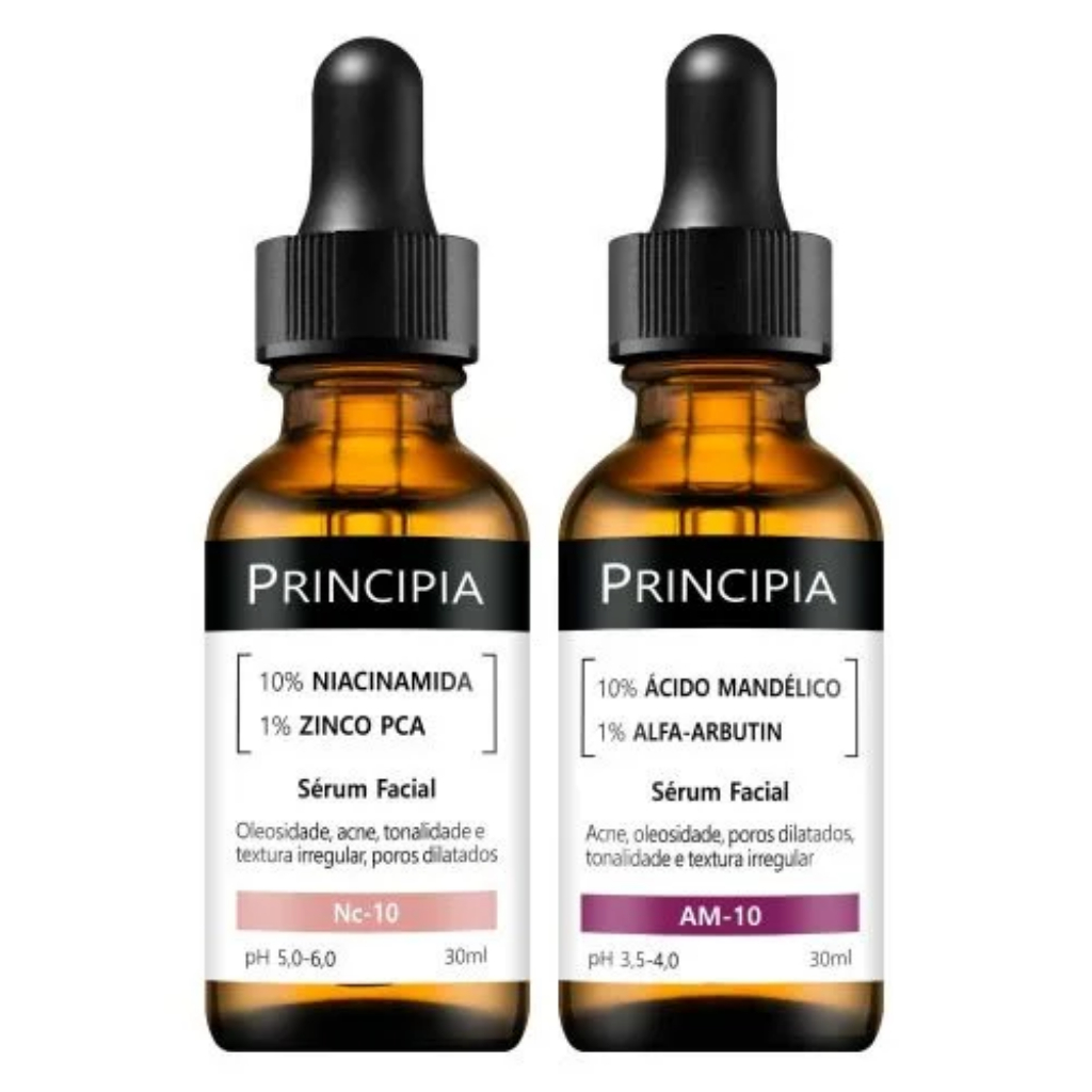 Kit com um sérum com 10% de Niacinamida + Zinco e um sérum com 10% de Ácido Mandélico + Alfa-arbutin para uma rotina com alta eficácia contra manchas, cravos, acnes e oleosidade. INDICAÇÕES » Clarear manchas » Reduzir e prevenir › acnes › cravos » Uniformizar a textura » Diminuir tamanho dos poros » Aumentar a luminosidade » Controlar a oleosidade » Diminuir linhas de expressão » Proporcionar maciez » Melhorar o viço » Aumentar a elasticidade » Para todos os tipos de pele INGREDIENTES ATIVOS NIACINAMIDA Uma forma estável de vitamina B3 capaz de entregar diversos benefícios para a pele, tais como redução de acnes e cravos e controle da oleosidade, comprovados em estudos publicados em diversos médico-científicos. É um precursora dos cofatores NADH (nicotinamida e adenina dinucleotídeo) e NADPH (fosfato de nicotinamida e adenina dinucleotídeo), que em suas formas reduzidas agem como coenzimas em dezenas de reações bioquímicas. ÁCIDO MANDÉLICO Derivado do extrato de amêndoas amargas, tem maior peso molecular e promove uma renovação celular mais suave que outros alfa-hidroxiácidos, estimulando a renovação celular, acelerando o processo de regeneração natural da pele, regulando a produção de sebo e contribuindo para a desobstrução dos poros. ALFA-ARBUTIN Ingrediente ativo biossintético que atua na síntese de melanina epidérmica regulando a pigmentação da pele, uniformizando seu o tom e reduzindo manchas escuras. ZINCO PCA Uma associação de Zinco e L-PCA. O Zinco ajuda a normalizar a secreção sebácea e reduzir a proliferação de bactérias que podem causar acne, enquanto o L-PCA contribui em processos que promovem a hidratação da pele. MODO DE USO » Deixe o rosto limpo e seco » Use a Niacinamida diariamente pela manhã » A noite, aplique o Ácido Mandélico, seguido pela Niacinamida, inclusive na área dos olhos » Na primeira semana, use o Ácido Mandélico em noites alternadas » Aplique antes de cremes, protetor solar e maquiagem » Sem encostar a cânula da pele, dispense algumas gotas nos dedos ou diretamente na face » Espalhe suavemente pelo rosto e, quando indicado, na área dos olhos DÚVIDAS FREQUENTES Contêm parabenos, petrolatos e sulfatos? Não. Suas composições também não incluem silicones, fragrância nem glúten. Estão regularizadas na Anvisa? Sim, conforme os processos números 25351.511390-2020-41 e 25351.895277-2021-99. Causa descamação da pele? Em geral, não provoca descamação visível da pele. Foram testadas em animais? Não. A PRINCIPIA não realiza testes em animais. Qual o prazo de validade? Três anos, contados da data de fabricação. Causa acnes ou cravos? Não. Pelo contrário, costumam ter efeitos benéficos e serem recomendadas para peles acnêicas.
