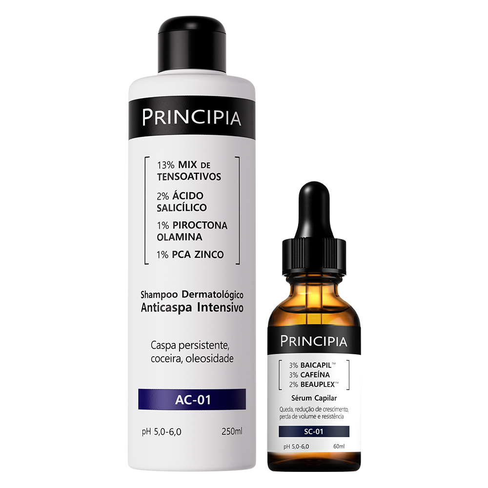 Kit com dois produtos para cuidados com o cabelo: um shampoo anticaspa com 13% de Mix de Tensoativos + 2% de Ácido Salicílico + 1% Piroctona Olamina e 1% PCA Zinco, com alta eficácia na redução da caspa persistente, controle da oleosidade e da coceira e um sérum capilar com 3% de Baicapil + 3% de Cafeína e 2% de Beauplex indicado para redução da queda e crescimento do cabelo. INDICAÇÕES Principais »Aliviar a coceira »Controlar a oleosidade »Estimular o crescimento »Fortalecer os fios »Reduzir a queda »Reduzir caspas »Remover impurezas Complementares »Aumentar o brilho »Proporcionar maciez »Proporcionar volume »Recuperar a pigmentação »Reduzir o frizz Tipos de cabelo »Todos MODO DE USO AC-01 (MIX DE TENSOATIVOS + SALICÍLICO + PIROCTONA OLAMINA + PCA ZINCO) » Use diariamente » Aplique no couro cabeludo e cabelos úmidos, massageando delicadamente, deixe agir por 2 minutos e enxague SC-01 (BAICAPIL + CAFEÍNA + BEAUPLEX) » Use diariamente, de preferência à noite » Dispense algumas gotas no couro cabeludo, massageando suavemente » Evite lavar o cabelo após a aplicação » Evite contato com os olhos » Em caso de contato acidental com os olhos, enxague abundantemente » Mantenha fora do alcance de crianças » Não use em crianças INGREDIENTES ATIVOS ZINCO PCA Uma associação de Zinco e L-PCA. O Zinco ajuda a normalizar a secreção sebácea e reduzir a proliferação de bactérias que podem causar acne, enquanto o L-PCA contribui em processos que promovem a hidratação da pele. ÁCIDO SALICÍLICO Beta-hidroxiácido com propriedades antibacterianas e antifúngicas, promove a esfoliação do estrato córneo, removendo células mortas, controlando a oleosidade e inibindo a incidência de acnes e cravos. Sua ação queratolítica também aumenta a permeabilidade da pele à outros ingredientes ativos. CAFEÍNA Um alcaloide metilxantina encontrado em diversas fontes de origem natural como grãos de café e folhas de chá. Com propriedades vasoconstritora, anti-inflamatória e antioxidante, tem alta eficácia contra olheiras e bolsas na área dos olhos, e na redução e clareamento de manchas na pele. Em formulações capilares, melhora a circulação sanguínea e inibe os efeitos do hormônio DHT, preservando os folículos e estimulando o crescimento do cabelo. BAICAPIL Associação de baicalina, composto com propriedades anti-inflamatórias utilizado na medicina tradicional chinesa, e outros ingredientes de origem botânica, que age nas células do folículo capilar, reduzindo a queda e estimulando o crescimento do cabelo. BEAUPLEX Composto com vitaminas B3, B5, B6, C e E, conhecido pelos benefícios para o couro cabeludo e pela eficácia na redução da queda, estimulo do crescimento, aumento da densidade e espessura do cabelo. TENSOATIVOS Substâncias com capacidade de degradar e emulsificar gorduras e óleos, e suspender partículas sólidas, facilitando sua remoção com água, são amplamente utilizados em formulações para limpeza da pele. Existem vários tipos de tensoativos, sendo normalmente classificados como catiônicos, aniônicos, não-iônicos e anfóteros, em função das características dos íons que podem ser gerados quando essas substâncias estão em solução aquosa. PIROCTONA OLAMINA Substância com alta eficácia contra bactérias e fungos inclusive os relacionados a ocorrência de caspa, irritação e coceira do couro cabeludo. DÚVIDAS FREQUENTES Contém parabenos, petrolatos e sulfatos? Shampoo anticaspa AC-01: Sua composição não contém parabenos, petrolatos, corantes, silicones, nem glúten. Contém sulfato. Sérum Capilar SC-01: Não. Sua composição também não inclui silicones, fragrância e corantes. Contém glúten. Está regularizada na Anvisa? Sim, conforme o processo número 25351.842478/2023-55, 25351.452744-2022-71. Foi testada em animais? Não. A PRINCIPIA não realiza testes em animais. Qual o prazo de validade? Três anos, contados da data de fabricação. Pode ser usada junto com outras fórmulas? Sim. Praticamente não há restrições para uso conjunto com outros ativos.