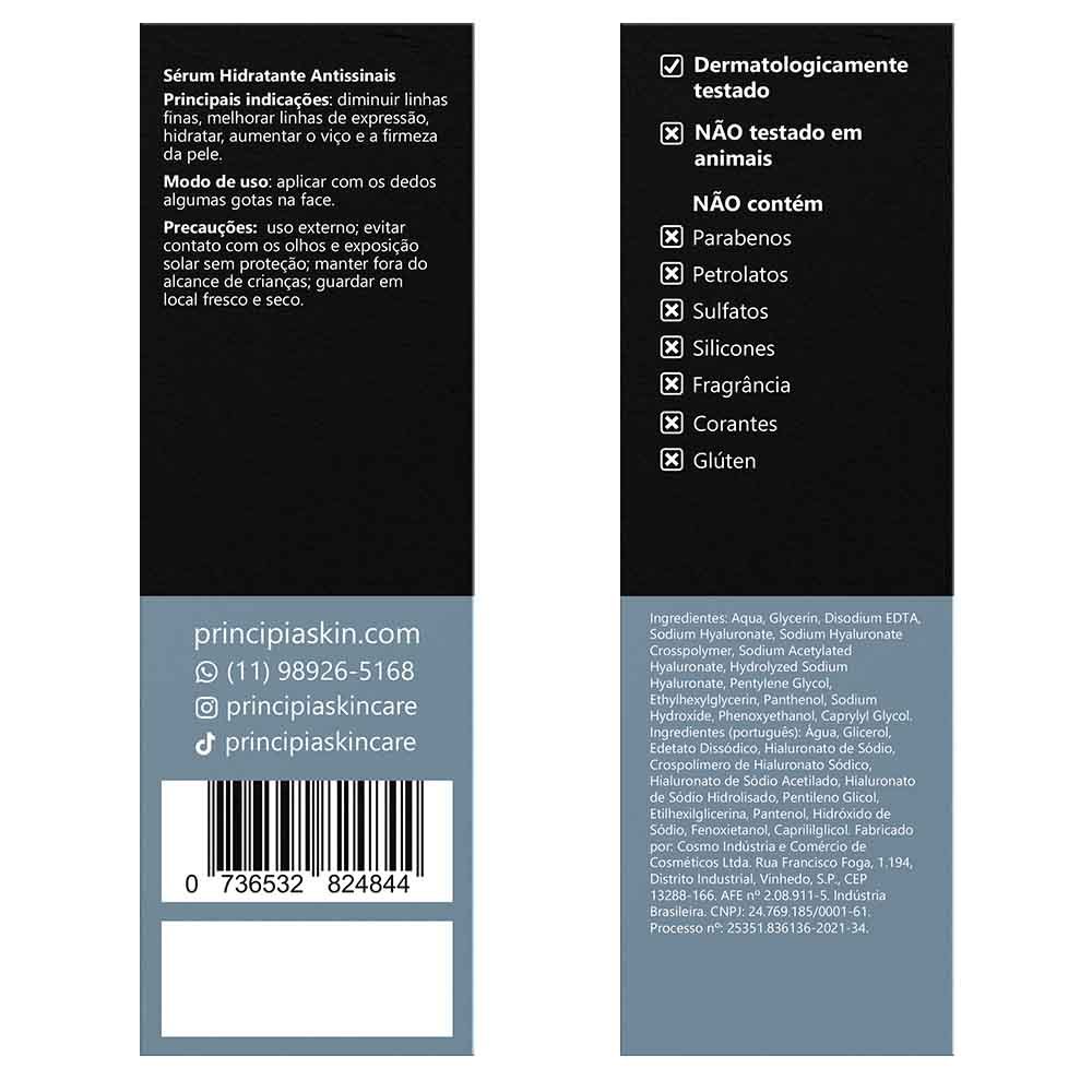 Kit com três fórmulas de skincare para uma rotina básica: gel de limpeza com 11,5% de mix de tensoativos, 10% de glicerina e 1% de PCA sódio, um sérum de composição de ácidos hialurônicos + vitamina B5 e um protetor solar fluido antioleosidade com mix de filtros UV + niacinamida, FPS 60, toque seco e com eficácia contra raios UVA e UVB. INDICAÇÕES Principais Principais »Aumentar a firmeza e elasticidade »Controlar a oleosidade »Melhorar o viço »Promover hidratação »Proteger contra o sol »Auxiliar na proteção contra a luz visível e luz azul »Reduzir tamanho dos poros »Remover impurezas »Suavizar rugas e linhas finas Complementares »Diminuir olheiras e bolsas »Proporcionar maciez »Reduzir e uniformizar a pigmentação Tipos de pele »Sensível »Todos MODO DE USO » Diariamente, aplique as fórmulas na seguinte sequência: Manhã: Gel de Limpeza > Ácidos Hialurônicos > Protetor Solar Noite: Gel de Limpeza > Ácidos Hialurônicos GEL DE LIMPEZA GL-02 350G » Use todos os dias, de manhã e à noite » Aplique uma pequena quantidade na face úmida e massageie até fazer espuma, enxaguando em seguida » Evite contato com os olhos » Mantenha fora do alcance de crianças » Não use em crianças » Guarde em local fresco e seco AH-2 (COMPOSIÇÃO DE ÁCIDOS HIALURÔNICOS + VITAMINA B5) » Use diariamente de manhã e à noite » Aplique antes de cremes, protetor solar e maquiagem » Deixe o rosto limpo e seco » Sem encostar a cânula da pele, dispense algumas gotas nos dedos ou diretamente na face » Espalhe suavemente pelo rosto, inclusive na área dos olhos Aplique na área dos olhos PS-01 (MIX DE FILTROS UV + NIACINAMIDA) » Use diariamente antes da exposição ao sol » Aplique abundantemente sobre a pele seca » Reaplique sempre após sudorese intensa, nadar ou banhar-se, secar-se com toalha e durante a exposição ao sol * AH-2 (COMPOSIÇÃO DE ÁCIDOS HIALURÔNICOS + VITAMINA B5) » Evite contato com os olhos e exposição solar sem proteção » Mantenha fora do alcance de crianças » Guarde em local fresco e seco * GL-02 (MIX DE TENSOATIVOS ++ GLICERINA + SÓDIO) » Evite contato com os olhos » Mantenha fora do alcance de crianças » Não use em crianças » Guarde em local fresco e seco * PS-01 (MIX DE FILTROS UV + NIACINAMIDA) » Mantenha fora do alcance de crianças » Em caso de contato acidental com os olhos, enxaguar abundantemente » Havendo irritação, suspenda o uso e procure por orientação médica INGREDIENTES ATIVOS ÁCIDO HIALURÔNICO Presente naturalmente na pele, têm alta capacidade de atrair e reter líquidos. Apenas um grama deste ativo pode reter até um litro de água. Existem vários tipos de Ácidos Hialurônicos, com pesos moleculares, propriedade e finalidades distintas. Enquanto as moléculas maiores formam filme na superfície, as menores conseguem penetrar em camadas mais profundas da pele. VITAMINA B5 Substância de origem natural que proporciona diversos benefícios como aumento da hidratação superficial, elasticidade e maciez da pele, além de apresentar propriedades anti-inflamatórias. GLICERINA Composto orgânico hidrofílico, considerado um dos mais eficazes umectantes utilizados em formulações para cuidados com a pele, proporciona hidratação devido sua capacidade de atrair e reter líquidos. TENSOATIVOS Substâncias com capacidade de degradar e emulsificar gorduras e óleos, e suspender partículas sólidas, facilitando sua remoção com água, são amplamente utilizados em formulações para limpeza da pele. Existem vários tipos de tensoativos, sendo normalmente classificados como catiônicos, aniônicos, não-iônicos e anfóteros, em função das características dos íons que podem ser gerados quando essas substâncias estão em solução aquosa. PCA SÓDIO Umectante derivado do ácido glutâmico obtido através do melaço da cana-de-açúcar, está presente naturalmente na pele, ajudando a prevenir a perda de água e melhorando a hidratação da pele. NIACINAMIDA Forma estável de vitamina B3 capaz de entregar diversos benefícios para a pele, tais como redução de acnes e cravos e controle da oleosidade, comprovados em estudos publicados em diversos médico-científicos. FILTROS UV Ingredientes que absorvem ou refletem raios UVA e UVB protegendo a pele contra danos causados pela exposição ao sol tais como aparecimento de manchas, queimaduras solares, envelhecimento prematuro e câncer de pele. DÚVIDAS FREQUENTES Contêm parabenos, petrolatos e sulfatos? Não. Suas composições também não incluem silicones, fragrância nem glúten. Estão regularizadas na Anvisa? Sim, todos os produtos são devidamente regularizados junto a Anvisa. Causa descamação da pele? Em geral, não provoca descamação visível da pele. Foram testadas em animais? Não. A PRINCIPIA não realiza testes em animais. Qual o prazo de validade? Três anos, contados da data de fabricação. Causa acnes ou cravos? Não. Pelo contrário, costumam ter efeitos benéficos e ser recomendadas para peles acnêicas.