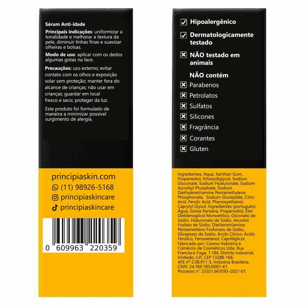 Sérum Principia Vitamina C-10 é um produto com 10% de Vitamina C e 0,5% de Ácido Ferúlico, desenvolvido para combater linhas finas, olheiras e hiperpigmentação. INDICAÇÕES Principais » Reduzir e uniformizar a pigmentação » Clarear manchas escuras » Suavizar rugas e linhas finas » Diminuir olheiras e bolsas Complementares » Diminuir cravos e espinhas » Controlar a oleosidade » Reduzir tamanho dos poros » Proporcionar maciez » Melhorar o viço Tipos de pele » Todos INGREDIENTES ATIVOS ÁCIDO FERÚLICO Encontrado em sementes, folhas e cascas de plantas, como um ácido livre ou na forma de ester. Possui propriedades antioxidante e anti-inflamatória, protegendo componentes da estrutura da pele como queratinócitos, fibroblastos, colágeno e elastina. VITAMINA C Essencial para várias funções vitais, tem ação antioxidante que protege as células da pele contra os efeitos dos radicais livres, como os causados pela exposição a radiação solar. Não sendo sintetizada pelo organismo humano, é necessária a obtenção de vitamina C de fontes externas, inclusive por aplicação tópica. O ácido ascórbico é a única forma biologicamente ativa da vitamina C, enquanto outras formas derivadas são mais estáveis e podem ser convertidas em ácido ascórbico ao contato com a pele. A vitamina C estimula a produção de colágeno e fibroblastos, atua na formação de barreira cutânea e reduz a hiperpigmentação da pele. MODO DE USO » Use diariamente pela manhã e à noite » Aplique antes de cremes, protetor solar e maquiagem » Mantenha o rosto limpo e seco » Sem tocar a cânula na pele, dispense algumas gotas nos dedos ou diretamente na face » Espalhe suavemente pelo rosto, incluindo a área dos olhos » Evite contato com os olhos e exposição solar sem proteção adequada » Não recomendado para uso em crianças » Conserve em local fresco e seco DÚVIDAS FREQUENTES Contém parabenos, petrolatos e sulfatos? Não. A composição é livre de silicones, fragrância e glúten. Está aprovado pela Anvisa? Sim, conforme processo número 25351.663593-2021-01. Causa descamação da pele? Normalmente, não causa descamação visível da pele. Testado em animais? Não. A marca não realiza testes em animais. Prazo de duração? Dois anos a partir da data de fabricação. Pode ser combinado com outras fórmulas? Sim, é compatível com a maioria dos ativos. Aplicação na área dos olhos é segura? Sim, com segurança e eficácia comprovadas para essa região. Provoca acne ou cravos? Não, geralmente tem efeito positivo e é indicado para peles com tendência a acne.