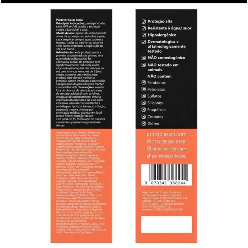 🌞 Proteja sua pele com o PRINCIPIA PS-01 FPS 40 – 40ml! 🌞 Descubra o Protetor Solar Facial Principia PS-01 FPS 40, especialmente desenvolvido para todos os tipos de pele, inclusive as oleosas. Com 14% de mix de filtros UV + 5% de Niacinamida, proporciona alta proteção contra raios UVA, UVB, luz visível e luz azul, prevenindo manchas, queimaduras e envelhecimento precoce. ✨ Benefícios incríveis: Toque seco e rápida absorção Controla a oleosidade por até 12h Reduz e uniformiza pigmentação da pele Resistente à água e ao suor Hipoalergênico, não comedogênico e sem fragrância Fórmula livre de parabenos, petrolatos, sulfatos, silicones, corantes e glúten Dermatológica e oftalmologicamente testado 💧 Modo de uso: Aplique generosamente sobre a pele seca do rosto antes da exposição ao sol. Reaplique após transpiração intensa, nadar ou se secar com toalha. Garanta um cuidado completo para sua pele com toque seco, proteção e conforto, todos os dias. Perfeito para uso diário e especialmente para quem quer combinar proteção solar com controle da oleosidade. 🛒 Adquira agora e dê à sua pele a proteção que ela merece! PRODUTO ORIGINAL | ENVIO IMEDIATO📦