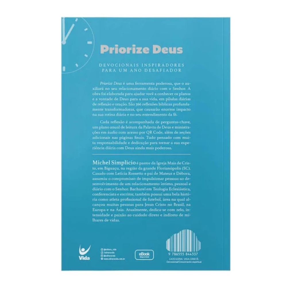 DEVOCIONAIS INSPIRADORES PARA UM ANO DESAFIADOR Priorize Deus é uma ferramenta poderosa, que o auxiliará no seu relacionamento diário com o Senhor. A obra foi elaborada para ajudar você a conhecer os planos e a vontade de Deus para a sua vida, em pílulas diárias de reflexão e oração. São 366 reflexões bíblicas profundamente transformadoras, que causarão enorme impacto na sua rotina diária e no seu entendimento da fé. Cada reflexão é acompanhada de perguntas-chave, um plano anual de leitura da Palavra de Deus e ministrações em áudio com acesso por QR Code, além de seções adicionais nas páginas finais. Tudo pensado com muita responsabilidade e dedicação para tornar a sua experiência diária com Deus ainda mais poderosa.