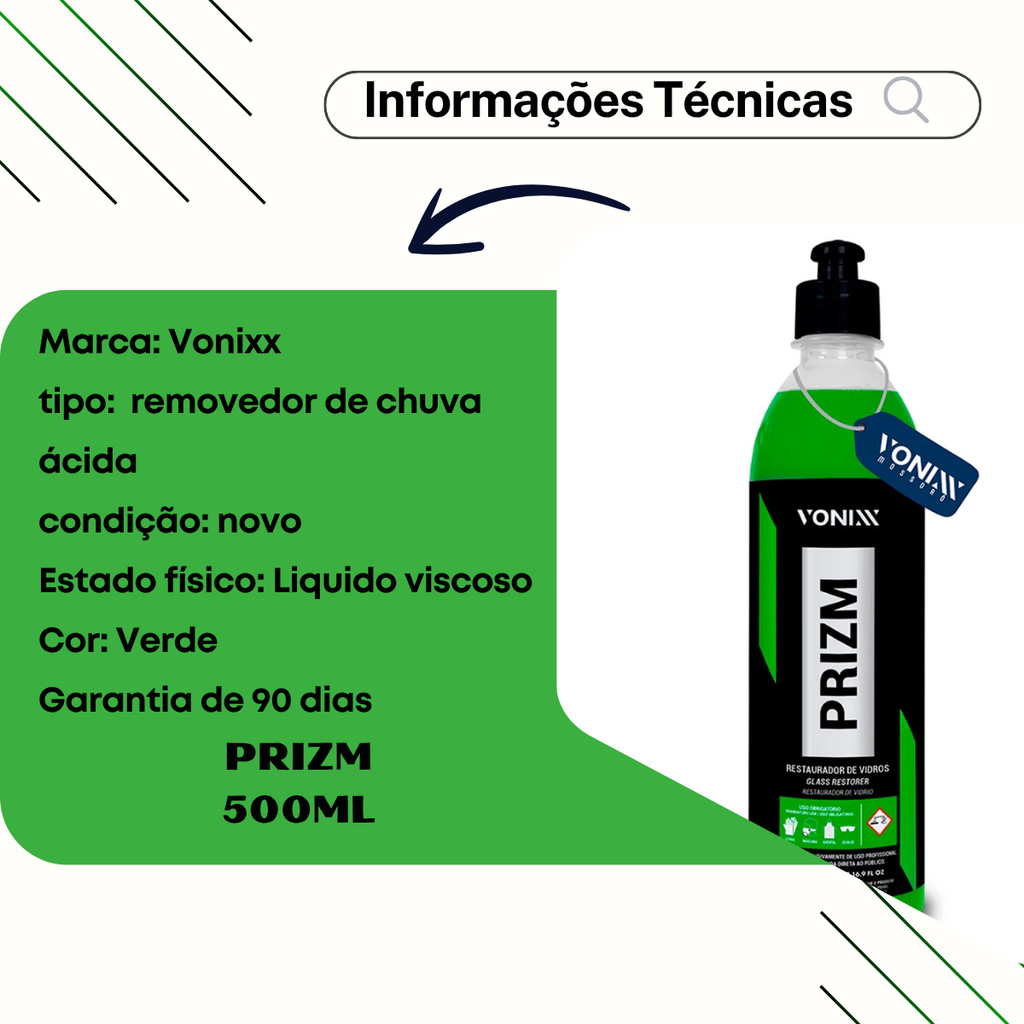 🚗 Bem-vindo!! Você está em uma loja especializada em soluções automotivas seguras e confiáveis. sua família, sua segurança e seus melhores momentos na estrada. ✨ Prizm 500ml Vonixx - Removedor de Chuva Ácida ✨ Prizm restaura a transparência em vidros automotivos remove marcas de água incrustadas, impurezas e contaminantes que não saem com a limpeza convencional. O produto age quimicamente contra as manchas e sujeiras, removendo-o facilmente de para-brisas, vidros laterais e traseiros. 🔍 Referência 35465 🧴 Informações 🏷️ Marca: Vonixx 🧪 Tipo: Removedor de chuva ácida 📦Condição: Novo ⚖️ Volume: 500ml 👀Estado: líquido 🕒 Garantia: 90 dias ❗ Antes de realizar seu pedido, esclareça suas duvidas 🚘 Aplicações Ideais: ✅ Vidros ✅ Partes metálicas com pequenas manchas 🌟 Principais Características: 🧼Limpeza química: Age quimicamente para remover manchas de chuva ácida, marcas d'água incrustadas e outros contaminantes que limpezas comuns não removem. 👨🔬Uso profissional: É um produto de uso profissional, e a aplicação requer cuidado e equipamentos de proteção individual (EPI). 🔍Restauração da transparência: Devolve a transparência original aos vidros de carros, boxes de banheiro e janelas. 🚫Não agressivo a espelhos: Não deve ser aplicado em espelhos automotivos para evitar danos à camada prateada 🧾 Modo de usar: Modo de Usar: Lave a superfície: Antes de começar, lave e limpe bem o vidro com água e sabão para remover a sujeira mais superficial. Faça um teste: Aplique o produto em uma pequena área do vidro para verificar a reação e garantir que não haverá danos ou manchas. Aplique em pequenas áreas: Use um aplicador de microfibra ou um pincel. O produto pode ser aplicado diretamente no vidro ou no aplicador. Esfregue o produto: Esfregue o produto na superfície com movimentos laterais ou circulares por aproximadamente 40 segundos, exercendo pressão moderada. Não esfregue por mais de um minuto para evitar danos. Não deixe o produto secar: O Prizm não pode secar sobre a superfície. Mantenha-a molhada durante todo o processo. Se a área começar a secar, umedeça o aplicador e aplique novamente. Enxágue abundantemente: Após o tempo de ação, enxágue imediatamente a área com bastante água. Certifique-se de remover todo o resíduo do produto. Repita se necessário: Se as manchas persistirem, o processo pode ser repetido, mas com cautela. 🛒 Adquira agora o Prizm 500ml Vonixx - Removedor de chuva ácida de Alta Qualidade em uma de nossas Lojas Oficiais: Camillo Parts, Genuine Automotive ou Edumac Parts, e tenha a certeza de estar comprando um produto de alta qualidade, com a garantia e o suporte que você merece. Proibimos o uso, cópia ou alteração de nossas fotos, imagens e conteúdo presentes nos anúncios. Conforme a Lei 9.610/98, qualquer violação será tratada legalmente, pois possuímos direitos autorais sobre este material.