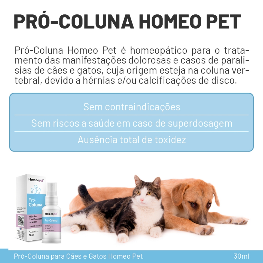 A LeluPets nasceu de uma paixão e dedicação de aproximadamente 20 anos de experiência nessa área tão incrível. Desde o início de nossa história, já são mais de 100 mil clientes atendidos. Estamos aqui determinados em fazer a diferença, democratizando e simplificando o cuidado com o seu pet para oferecer a melhor experiência para você e seu amiguinho. Mantemos nossas orelhas em pé, atentos às novidades do mundo pet para trazê-las até você. Nós somos apaixonados por pets! O seu pet é também da nossa família! Pro-Coluna 30ml Homeopatia Para Cães e Gatos A Realh Hemolipet criou Pró-Coluna um composto homeopático indicado para cães e gatos de todas as idades e portes, que combate problemas de hérnias e calcificações de disco, tratando, controlando e evitando agravamento, assessorando os animaizinhos que tens problemas na coluna vertebral. Nossos peludos merecem ter uma vida completamente feliz e longe de desagradáveis desconfortos. Além de fácil aplicação, não tem riscos de intoxicação e/ou contaminação. Expõem formula gerada de matéria prima natural, um composto com ausência total de toxidez. Pro-Coluna pode ser administrado diretamente na boca do nosso cãozinho ou nas patinhas do gatinho, também na água ou alimento. Lembrando que colocada no alimento o consumo dever ser imediato, na água se deve colocar a dosagem completa do dia e ser consumido em até 24 horas. - Indicado para cães e gatos; - Homeopático; - No tratamento de Hérnias Calcificações de Disco; - Formula natural; - Spray; - Fácil aplicação - Atente-se à Pro-Coluna bula e/ou informações da embalagem; - Consulte um médico veterinário de sua confiança para o uso apropriado deste produto; - Disponível em frasco com 30ml