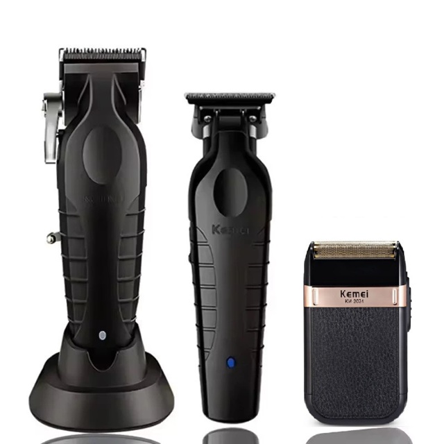 Kit de Máquinas Kemei 2296, Kemei 2299 e Shaver Kemei KM-2024 Design: Preto elegante Máquina de Corte Kemei 2296: Lâminas afiadas e motor potente para cortes precisos, rápidos e com facilidade Máquina de Acabamento Kemei 2299: Projetada para detalhes impecáveis Ideal para contornos, barbas e detalhes que fazem toda a diferença Shaver Kemei KM-2024: Barbeador elétrico para finalização que corta os pelos na raiz, deixando a pele lisa Ideal para depilar partes do corpo e cabeça, especialmente para quem tem alergia a lâminas tradicionais Não deve ser utilizado em pelos grandes; recomendado usar máquina zero antes Características Adicionais Sem Fio: As máquinas Kemei 2296 e 2299 são sem fio e vêm com baterias recarregáveis Recarregável: Shaver KM-2024 tem entrada USB, leva 8 horas para recarregar e tem uma autonomia de uso de 45 minutos Duas Lâminas no Shaver KM-2024: Proporciona um corte mais rápido e eficiente