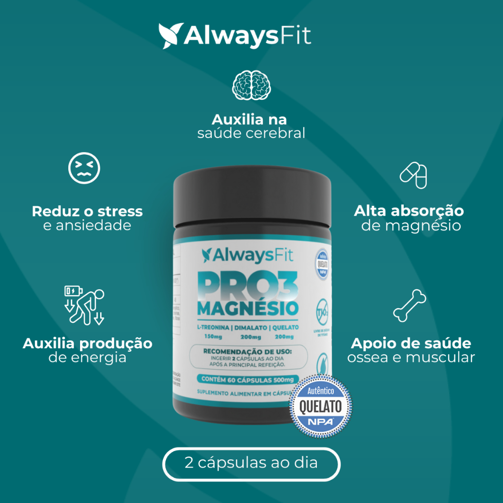 O que é o Pro3Magnésio? O Pro3Magnésio é um suplemento premium que combina três formas altamente biodisponíveis de magnésio: magnésio + treonina, magnésio quelato e magnésio dimalato. Essa fórmula completa foi desenvolvida para apoiar a saúde do cérebro, músculos, ossos, sistema nervoso e metabolismo energético, com máxima absorção e eficiência. Quais são seus benefícios? 🧠 Suporte ao sistema nervoso e à mente O magnésio contribui para o funcionamento do sistema nervoso, ajudando na transmissão de impulsos nervosos e no equilíbrio mental. 💪 Função muscular e recuperação Auxilia no funcionamento muscular e no processo de contração e relaxamento dos músculos. Ideal para quem sofre com cãibras ou treina intensamente. ⚡ Mais energia e menos fadiga Participa do metabolismo energético e ajuda na redução do cansaço e da fadiga, promovendo mais disposição ao longo do dia. 🦴 Manutenção de ossos e dentes saudáveis O magnésio atua na formação e manutenção de ossos e dentes, sendo fundamental para a estrutura e resistência do organismo. 🧬 Funções celulares essenciais Auxilia no processo de divisão celular, na formação de proteínas e no equilíbrio dos eletrólitos, mantendo o bom funcionamento metabólico. Por que a fórmula Pro3Magnésio é diferente? A combinação sinérgica entre: Magnésio + Treonina (Treonato): atravessa a barreira hematoencefálica, com foco na função cerebral e memória. Magnésio Quelato: alta absorção e eficácia no suporte muscular e ósseo. Magnésio Dimalato: ação energética, ideal para reduzir fadiga e melhorar o rendimento físico. Nosso magnésio quelato tem selo de pureza NPA, garantindo qualidade e absorção superiores. Como usar? Uso oral: tomar 2 cápsulas com 200 ml de água, preferencialmente após o jantar. INGREDIENTES: Bisglicinato de magnésio, malato de magnésio, óxido de magnésio, L-treonina e antiumectante dióxido de silício. Ingredientes da cápsula: gelatina. NÃO CONTÉM GLÚTEN Este produto não é um medicamento. Mantenha fora do alcance de crianças.