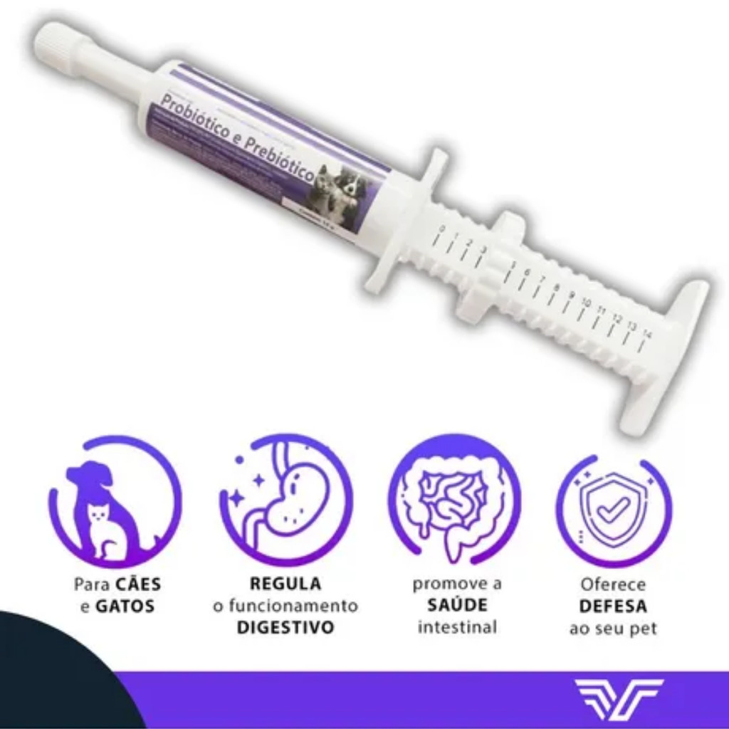 Suplemento Vitamínico Probiótico e Prebiótico Probfil Pet para Cães e Gatos Contém 8 seringas de 14g BENEFÍCIOS : - Regulariza e reconstrói a flora intestinal - Auxiliam na prevenção e tratamento das diarreias de origem bacteriana. - Aumentam as defesas naturais do organismo. - Melhora a consistência e o odor das fezes. - Mantem o equilíbrio da microbiota intestinal. - Favorece a digestibilidade dos alimentos e melhorando a absorção de nutrientes. DESCRIÇÃO: O Probfil é um suplemento vitamínico especialmente formulado para cães e gatos. Uma composição diferente das demais do mercado, conta com um probiótico natural, e não sintético, causa um efeito de rápida ação e eficaz nos PET's. O Probfil age nas necessidades orgânicas de vitaminas A, D, E e C para cães e gatos. Essas vitaminas desempenham papéis cruciais na saúde geral e no funcionamento do sistema imunológico dos animais. O Probfil é enriquecido com prébióticos e probióticos. Probióticos: São bactérias benéficas que ajudam a recompor a flora intestinal. Eles equilibram a microbiota, especialmente em casos de diarreia. Prébióticos: São substâncias que alimentam as bactérias benéficas no intestino. Eles criam um ambiente favorável para o crescimento dessas bactérias. MODO DE USAR: Uso oral, diretamente na boca do animal. Cães de raças pequenas, grandes e gatos: – Filhotes: 1g ao dia Adultos: 2g ao dia. Cães de raças médias e grandes: – Filhotes: 2g ao dia Adultos: 4g ao dia. - Filhotes Uso por 7 dias ou conforme a orientação do médico veterinário. - Adultos Uso por 10 dias ou conforme a orientação do médico veterinário. APRESENTAÇÃO: Bisnaga dosadora de 14g.