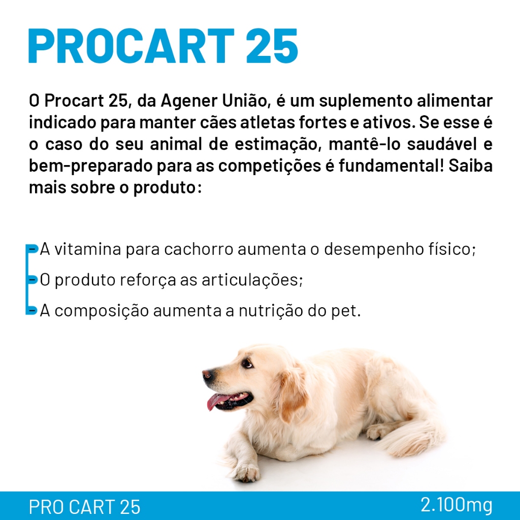 Procart 25 - 2.100mg C/60 comprimidos Descrição: O Suplemento Alimentar Agener União Procart 25 com extrato vegetal e mineral. Indicado para cães de grande porte com intensa atividade física. Sua fórmula estimula o colágeno, reduz enzimas que prejudicam a cartilagem do seu amigão. Posologia e modo de usar: Cães: Procart® 25: 1 cp. / 25 Kg / VO / a cada 24 horas.Informações do Pro Cart® 25 Indicações: - Indicado para cães; - Contém glicosaminoglicanos, extrato vegetal e minerais; - Auxilia melhoria das condições nutricionais; - Ideal para pets que praticam atividades físicas, - Disponível em embalagem com 60 comprimidos. Benefícios: - Melhora o condicionamento físico; - Fortalece as articulações, - Melhora a condição nutricional do peludo. - Contém fórmula que fortalece as articulações dos pets. Especificações: Idade: Adulto Pet: Cachorros Uso: Oral Tipo: Suplemento Apresentação: 60 comprimidos Indicação: Suplementação para cães adultos que praticam atividades físicas intensas
