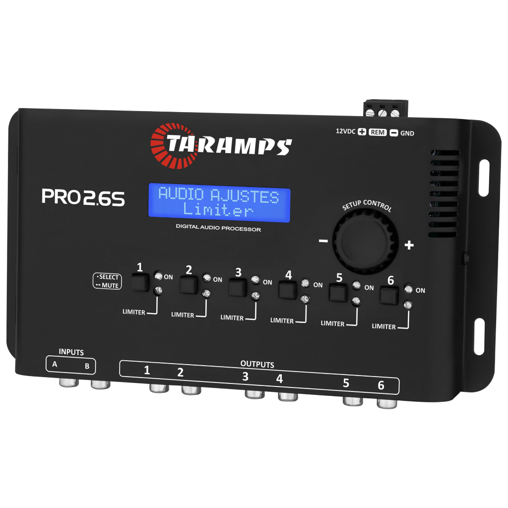 Dedicada em sempre facilitar a sua experiência com seu som automotivo, a Taramps inovou com processador de áudio PRO2.6S. Com DSP, 2 entradas e 6 saídas independentes, possui recursos como roteamento, filtros para crossover, ajuste de delay, alinhamento, inversão de fase, limiter ajustável, equalizador paramétrico nas saídas, espelhamento, mute, gerador de onda senoidal e memória para os ajustes. Praticidade e recursos para deixar seu sistema de som mais completo. Informações técnicas • Impedância de entrada: 18K Ohms • Impedância de saída: 47 Ohms • Nível máximo de entrada: 6Vpp (2.1V RMS) • Nível máximo de saída: 10.2Vpp (3.6V RMS) • Resposta em frequência: 10Hz ~ 20KHz • Relação Sinal/Ruído: >90dB • Crosstalk (separação entre canais): >80dB • Canais de Entrada: 02 • Canais de saída: 06 • Roteamento: A,B,A+B • Ganho Geral: 80 ~ 0dB • Ganho das saídas: 24 ~ +6dB • Crossover: - HPF(Variável): Filtros Variáveis - LPF(Variável): Filtros Variáveis • Alinhamento: 5.7 mS (194cm) • Fase: 0 / 180º • Threshold: 24 ~ 0dB • Attack: 1ms ~ 900ms • Release: 1ms ~ 4000ms • Equalizador paramétrico (3 bandas) por saída: - Frequência Central: 20Hz ~ 20KHz - Atenuação - Ganho: -12dB ~ +12dB - Fator Q: 0.4 ~ 10 • Faixa de Frequência: 20 Hz ~ 20 kHz • Ganho: -60 ~ 0dB • Idiomas: Português - Inglês - Espanhol • Posições de memória: 3 + padrão de fábrica • Tensão de Alimentação (POWER): 9 ~ 16VDC • Dimensões(L x A x P): 210 x 43 x 122mm • Peso: 0,550Kg Informações adicionais • Limiter Ajustável • Função de espelhamento das saídas • Função de MUTE individual nas saídas • Gerador de áudio
