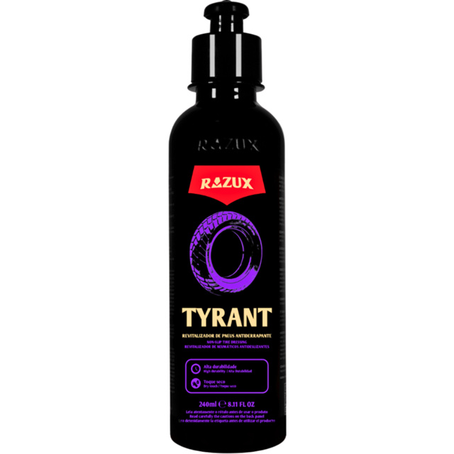 TYRANT 240ML - REVITALIZADOR DE PNEUS ANTIDERRAPANTE RAZUX DESCRIÇÃO: Tyrant é um revitalizador de pneus atiderrapante para motocicletas. Forma um filme seco, sem deixar com o aspecto pegajoso. Deixa o pneu com aspecto de novo, não sai com água e possui durabilidade de até 60 dias. Proporciona tranquilidade e segurança aos motociclistas MODO DE USO: 1. Limpar bem a superfície e em seguida aplicar o produto com um aplicador de espuma até a completa revitalização 2. Se necessário repetir a operação.