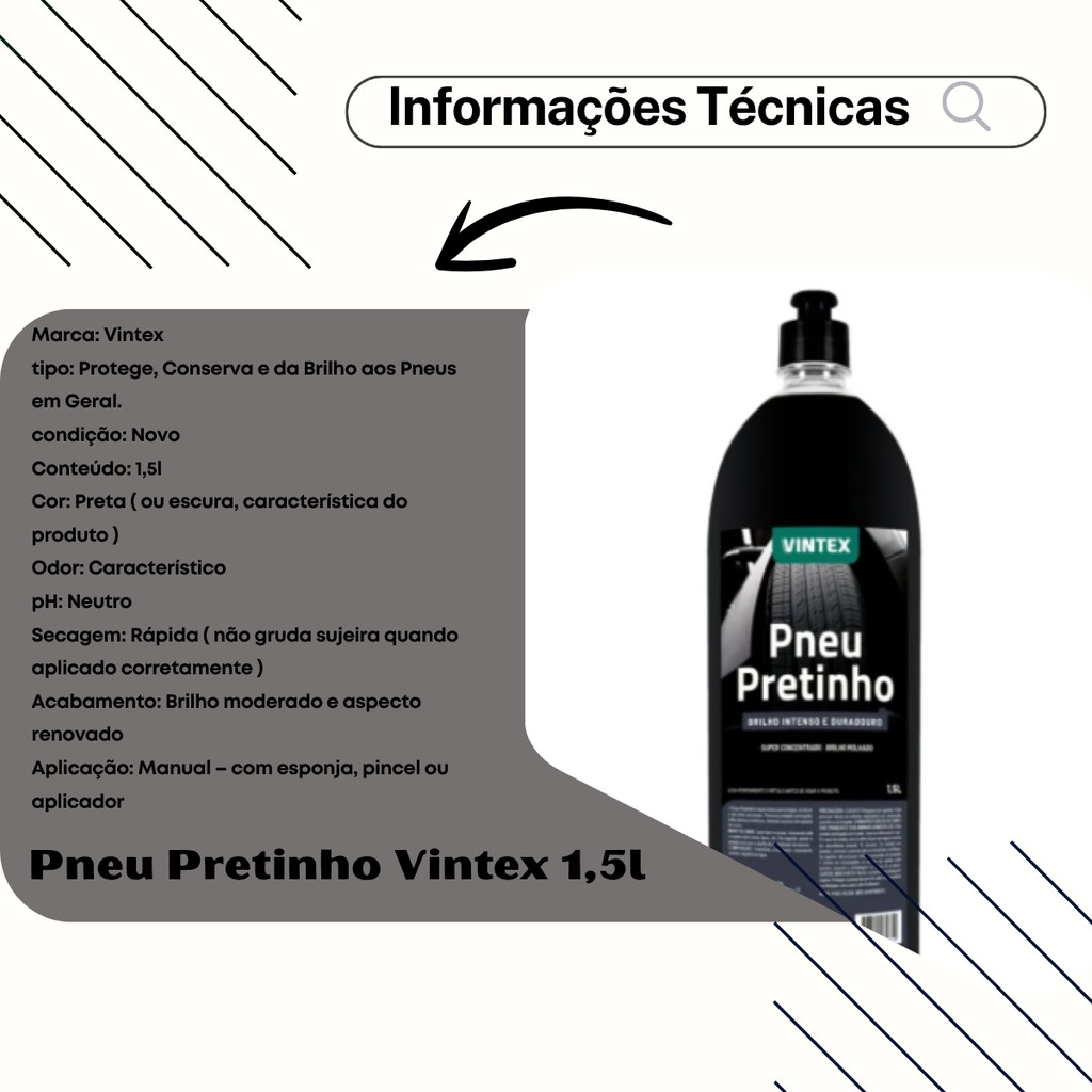 Bem vindo!! Você está em uma loja especializada em soluções automotivas seguras e confiáveis. Aqui, cada detalhe é pensado para cuidar do que move você: sua família, sua segurança e seus melhores momentos na estrada. 🛞 Pneu Pretinho Vintex 1,5L Protege, Conserva e Dá Brilho aos Pneus em Geral O Pneu Pretinho Vintex foi desenvolvido para proteger, conservar e realçar o brilho dos pneus, deixando um acabamento limpo, bonito e com aspecto de pneu novo. Proporciona brilho duradouro, proteção prolongada e ajuda a prevenir ressecamento e trincas na borracha. 🔁 Referências Compatíveis 35462 2008030 ℹ️ Informações do Produto: Marca: Vintex Função: Protege, conserva e dá brilho aos pneus Condição: Novo Conteúdo: 1,5 Litro Cor: Preta / escura (característica do produto) Odor: Característico pH: Neutro Secagem: Rápida (não gruda sujeira quando aplicado corretamente) Acabamento: Brilho moderado, aspecto renovado Aplicação: Manual (esponja, pincel ou aplicador) Garantia: 90 dias 🚗 Aplicações Ideal para: 🚙 Pneus de carros de passeio 🛻 SUVs, caminhonetes e utilitários 🏍️ Motocicletas 🚜 Veículos agrícolas e comerciais Pneus expostos ao tempo e uso frequente 🧽 Modo de Aplicação Lave e seque bem o pneu. Agite o frasco antes de usar. Aplique o produto com esponja, pincel ou aplicador. Espalhe uniformemente pela superfície do pneu. Aguarde a secagem (não precisa enxaguar). Reaplique sempre que desejar renovar o brilho e a proteção. ✨ Principais Benefícios ✨ Brilho moderado e uniforme 🛡️ Protege contra ressecamento, sol e desgaste da borracha ♻️ Ajuda a conservar e prolongar a vida útil do pneu 👌 Fácil de aplicar, não exige enxágue 🚫 Não gruda sujeira após a secagem 💧 Secagem rápida 🧩 Uso versátil para carros, motos, SUVs e utilitários 🛍️ Onde Comprar Adquira com segurança em uma de nossas Lojas Oficiais: ✅ Camillo Parts ✅ Genuine Automotive ✅ Edumac Parts Produto original, com qualidade garantida e suporte especializado. ⚠️ Direitos Autorais Proibimos o uso, cópia ou alteração de nossas fotos, imagens e conteúdo. Lei 9.610/98 – violação sujeita a medidas legais.