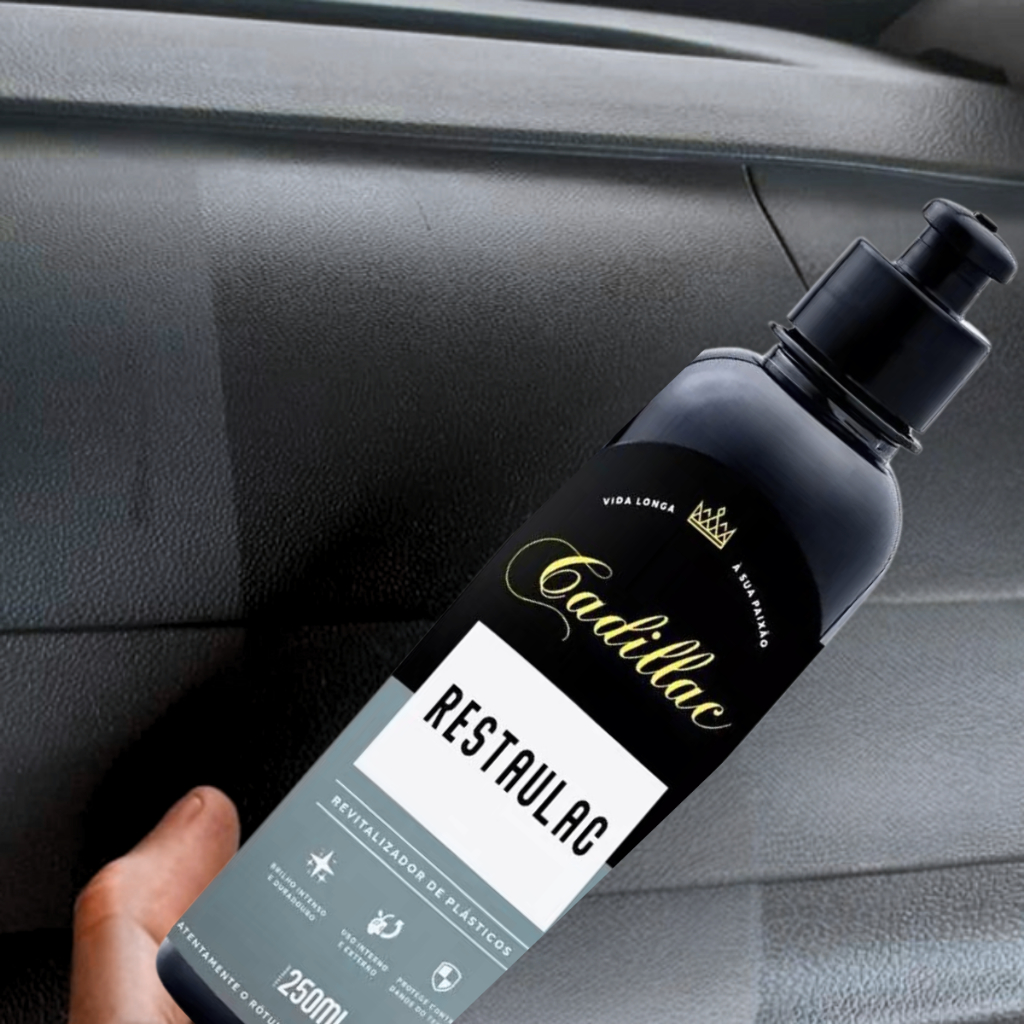 RESTAULAC 250ML - CADILLAC DESCRIÇÃO: Restaulac restaura para-choques, para-lamas, painéis, laterais de portas, entre outras partes do veículo. A formulação ainda garante uma camada de proteção para prevenir contra o ressecamento e desgaste, com uma super repelência à água DURABILIDADE: 6 meses para plásticos internos 3 meses para os plásticos externos - Uso Interno e Externo - Até 6 meses de proteção interna - Até 3 Meses de proteção externa - Brilho intenso e duradouro - Protege conta danos causados pelo tempo - Fácil aplicação - Versátil MODO DE USO: 1. Agite bem antes de usar 2. Antes de aplicar, certifique-se que a superfície esteja totalmente limpa. 3. Aplique uma camada fina de Restaulac com um aplicador de espuma ou toalha de microfibra. 4. Remova o excesso e aguarde a total secagem do produto.