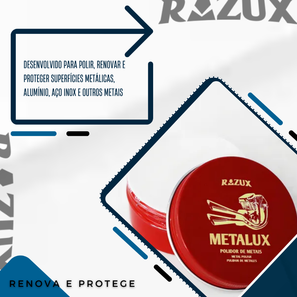 METALUX POLIDOR DE METAIS RAZUX / VONIXX 100G.....................................................................................................................................INFORMAÇÕES SOBRE O PRODUTO.....................................................................................................................................Desenvolvido para polir, renovar e proteger superfícies metálicas, alumínio, aço inox e outros metais.Disponível em 100g.....................................................................................................................................ESPECIFICAÇÕES DO PRODUTO.....................................................................................................................................Benefícios-POLIMENTO-PROTEÇÃO.Modo de UsoColoque uma pequena quantidade de produto em um aplicador de microfibra.Execute o polimento na superfície exercendo pressão e movimentos uniformes.Lustre a peça utilizando uma toalha de microfibra limpa e seca.Observe o resultado, se necessário repita a operação.DiluiçãoPronto uso.RecomendaçõesSuperfícies metálicas, como cromo, alumínio e aço inox.CuidadosCUIDADO! Perigosa sua ingestão. Pode provocar danos ao sistema respiratório por exposição repetida ou prolongada. CONSERVE FORA DO ALCANCE DAS CRIANÇAS E ANIMAIS DOMÉSTICOS. Evite contato prolongado com a pele. Lavar as mãos após o uso. Em caso de contato com os olhos, lavar com água corrente em abundância durante 15 minutos. Se inalado em excesso, remover a pessoa para local bem ventilado. Se ingerido, não provocar vômito e consultar de imediato Centro de Intoxicações ou Serviço de Saúde mais próximo, portando a embalagem ou rótulo do produto. CEATOX: 0800 014 8110. Manter o produto na embalagem original. Proteger o produto do sol e do calor. Não reutilizar a embalagem vazia para outra finalidadeInformações AdicionaisManter o produto na embalagem original. Proteger o produto do sol e do calor. Não reutilizar a embalagem vazia para outra finalidade.....................................................................................................................................DÚVIDAS FREQUENTES.....................................................................................................................................Pergunta: Como é embalado o produto?Resposta: Todos os nossos produtos vendidos são embalados em caixas lacradas ou plástico stretch. Em respeito ao meio ambiente 90% das caixas são reutilizadas.Pergunta: Quem faz a entrega?Resposta: A entrega é terceirizada, feita via CORREIOS ou TRANSPORTADORA.Pergunta: O envio é feito em quantos dias?Resposta: Nós enviamos o seu pedido no prazo máximo de 24 horas após a confirmação de sua compra, sendo um dos envios mais rápidos da plataforma.Pergunta: Os produtos são novos ou usados?Resposta: Todos os produtos que trabalhamos são novos e com qualidade garantida........................................................................................................................