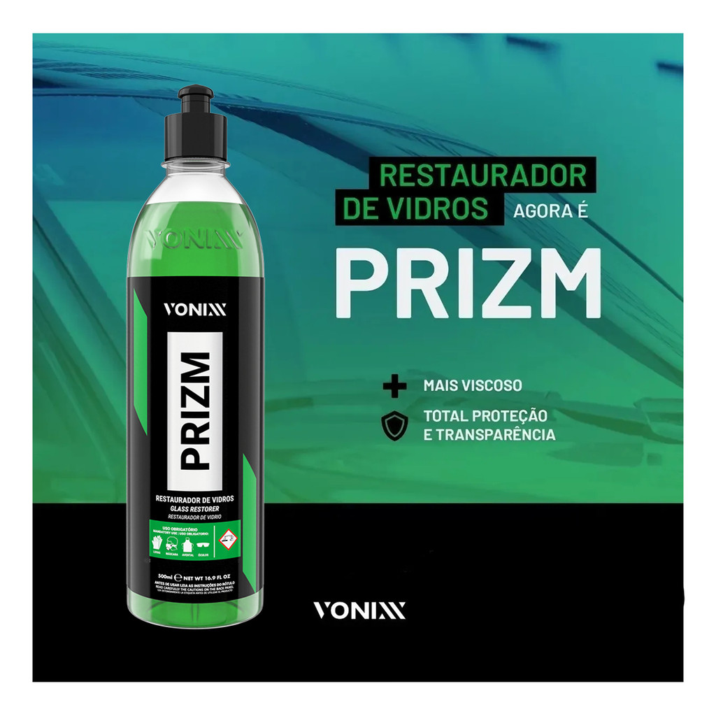 PRIZM RESTAURADOR DE VIDROS 500ML VONIXXO Restaurador de Vidros Vonixx é um produto desenvolvido para restaurar a transparência dos vidros automotivos em geral. Remove marcas de água e impurezas impregnadas.Atenção: Não deixar o produto escorrer para a pintura, pois poderá causar manchas irreversíveis.Modo de usar:- Aplique uma pequena quantidade do produto em um aplicador de espuma, e aplique no vidro fazendo movimentos circulares com pressão média.- Continue a aplicação por cerca de 1 minuto e não deixe o produto secar no vidro.- Enxágue em seguida com água em abundância.