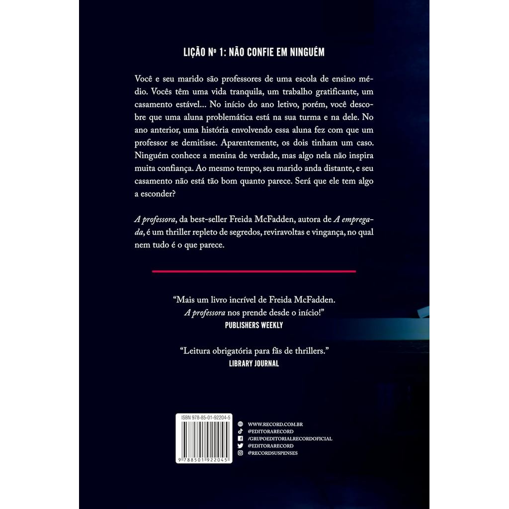 Da autora best-seller Freida McFadden, A professora é um thriller repleto de segredos, reviravoltas e vingança, no qual nem tudo é o que parece. Todos dizem que Eve tem uma vida boa. Ela tem um emprego estável, uma bela casa, um marido lindo... Tudo parece perfeito, como deveria ser. Mas nem tudo é como Eve gostaria que fosse. No ano anterior, um escândalo abalou o colégio onde ela leciona matemática. Segundo boatos, um professor, seu antigo mestre e amigo, teve um caso com uma aluna do ensino médio, Addie, e, por causa da polêmica, ele acabou pedindo demissão. Nada ficou devidamente esclarecido, e Eve suspeita que, por trás dessa história toda, exista algo bem mais sombrio. Addie não é confiável. Ela mente, magoa as pessoas e destrói a vida dos outros. Pelo menos é o que dizem. A questão é que ninguém conhece a verdadeira Addie. A adolescente guarda segredos que podem arruinar sua própria vida. Por isso, fará de tudo para que ninguém os descubra. “Mais um livro incrível de Freida McFadden. A professora nos prende desde o início!” ― Publishers Weekly “Leitura obrigatória para fãs de thrillers.” ― Library Journal