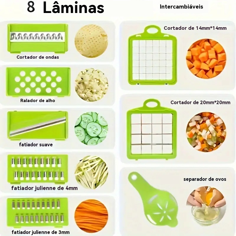 👏🏻👏🏻👏🏻Olá para todos e bem-vindos à nossa loja! 👏🏻👏🏻👏🏻 Características principais da rede: Versatilidade Superior da Versatilidade: 🥕 Com lâminas de aço inoxidável afiadas, nosso fatiador oferece a versatilidade necessária para cortar uma ampla gama de legumes facilmente, proporcionando fatias uniformes e consistentes. Segurança reforçada: 🔒 Equipado com um mecanismo de segurança intuitivo, nosso fatiador foi projetado para proteger as mãos durante o uso, minimizando o risco de cortes acidentais. Design ergonômico: 🖐️ O design ergonômico do nosso fatiador proporciona uma experiência de usuário confortável, permitindo cortar seus legumes de forma eficiente e sem esforços desnecessários. Limpeza fácil de limpar: 💧 Com peças removíveis e design colapsível, limpando nosso fatiador é rápido e simples, garantindo a higiene e durabilidade do produto. Compacto e Funcional: Compacto e Funcional: 📏 O design compacto do nosso fatiador o torna ideal para cozinhas de qualquer tamanho, enquanto sua funcionalidade excepcional o torna um aliado indispensável na preparação de refeições saudáveis e saborosas. Acompanha nada menos que 12 acessórios: 1) Cortador anatômico 2) Vasilha em acrílico com base antiderrapante em silicone 3) Escorredor de alimentos 4) Lâmina de corte em inox Grande 5) Lâmina de corte em inox Pequena 6) Lâmina de corte em rodelas 2mm de fatia 7) Lâmina de ralador 8) Lâmina de corte ondulado de batatas e legumes 9) Lâmina de corte Julienne 4mm 10) Lâmina de corte Julienne 3mm 11) Protetor de mãos 12) Separador de clara e gema Medidas: 32cm x 12 x 8 cm (Medidas aproximadas) Plástico abs, vasilha em acrílico e lâminas em inox Dicas importantes: O fatiador vegetal vem equipado com lâminas afiadas, você deve ter cuidado ao manuseá-las e não permitir que as crianças o usem sem supervisão adequada. Certifique-se de que as frutas e legumes sejam menores do que o porta-faca, caso contrário, podem ficar presos. Recomendamos o corte de legumes ou frutas mais macios, como tomate e pimentas, para cortar legumes mais macios ou frutas, como tomate e pimentas, recomendamos o uso de uma lâmina maior. Se você quiser cortar batatas ou cebolas, o tamanho do cortador de legumes pode ser ajustado de acordo com sua preferência. Pele de legumes ou frutas com peles duras, descasque-os primeiro antes de cortar.