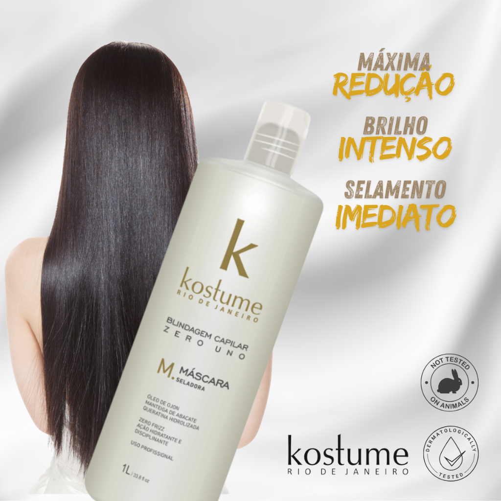 Máscara Zero Uno Blindagem para Escova Progressiva de Cabelo 1L - Kostume ZERO UNO ESCOVA PROGRESSIVA SEM FORMOL Cream Active Equalizador dos Fios 1000ml LIVRE DE: parabenos, petrolatos e cloreto de sódio (sal) *Dermatologicamente testado *Rende em média 15 aplicações É COMPATIVEL COM RELAXAMENTO? É compatível, PORÉM o cabelo precisa estar saudável. É muito importante fazer o teste de mechas e imprescindível realizar um teste de resistência na reaplicação da química. Como age?Sua ação direta ao córtex, promove o nivelamento dos filamentos fibrosos, conferindo o aumento da resistência dos fios. Recobre a camada cuticular, proporcionando retenção da umidade. A ação do calor (secador e prancha) memorizam o efeito liso, por isto, a importância de realizar o passo a passo. Resultado: equalização do relevo capilar, redução máxima, selamento imediato e brilho intenso. APLICAÇÃO: Veja como é simples a aplicação da Zero Uno. Você pode fazer no salão ou em casa. A Zero Uno é muito simples e prática de aplicar! Confira abaixo o passo a passo:- Após lavar com um shampoo anti resíduo, seque 100% os cabelos.- Com o auxílio de um pincel, aplique o produto em todo o comprimento do cabelo seco (NÃO NO COURO CABELUDO), da raiz às pontas, mecha a mecha. Alinhar o cabelo com a ajuda de um pente fino.- Aguardar um tempo de pausa de 40 minutos com touca metalizada (*nos cabelos finos, delicados e loiros, 20 minutos de pausa. Em cabelos resistentes 60 minutos de pausa). Após este tempo, alinhar novamente os fios, mecha a mecha, e enxaguar totalmente o produto.- Em seguida, realizar uma escova lisa até perceber o brilho dos fios. Pranchar em mechas finas de 10 a 12 vezes (*reduzir a temperatura da prancha em caso de cabelos loiros e finos).